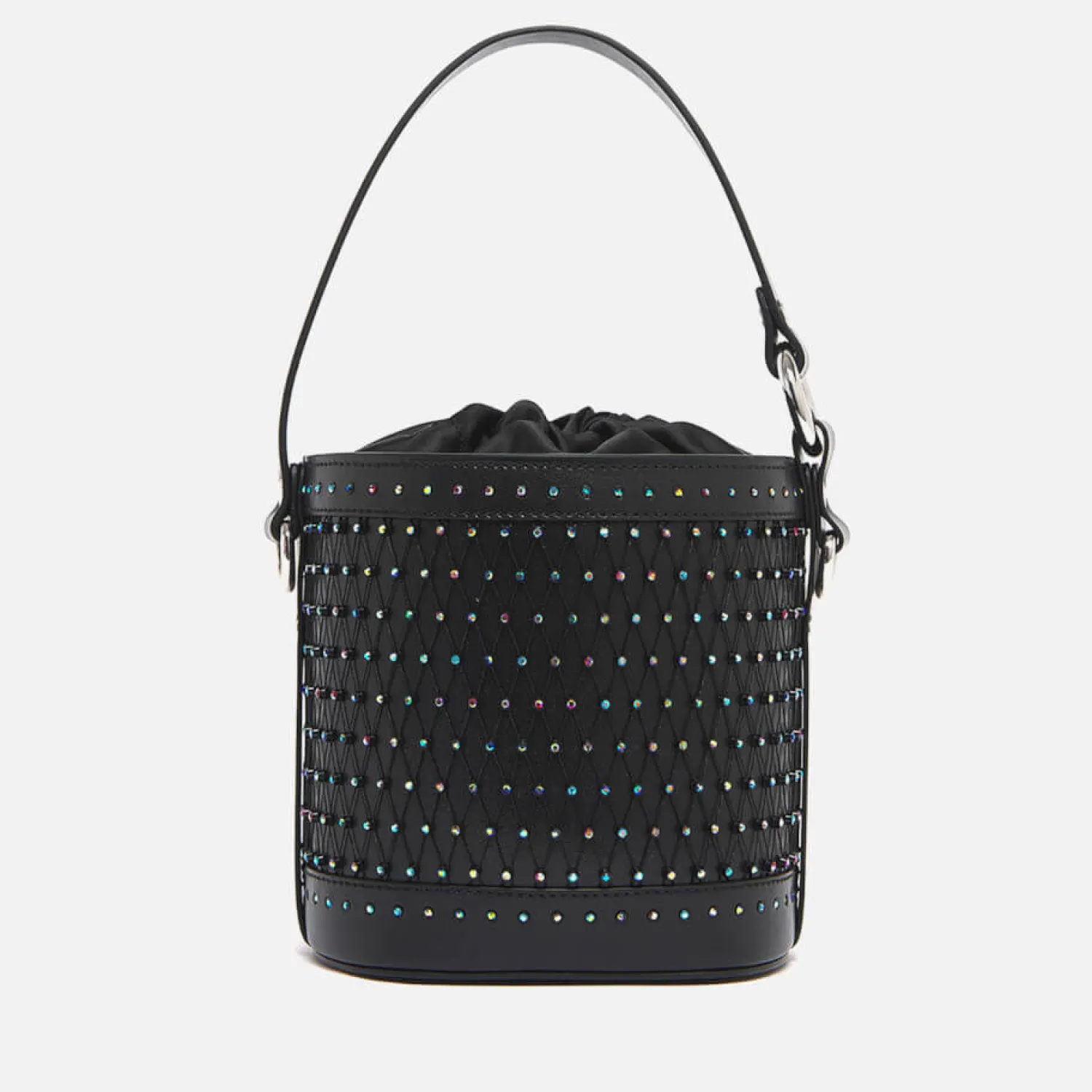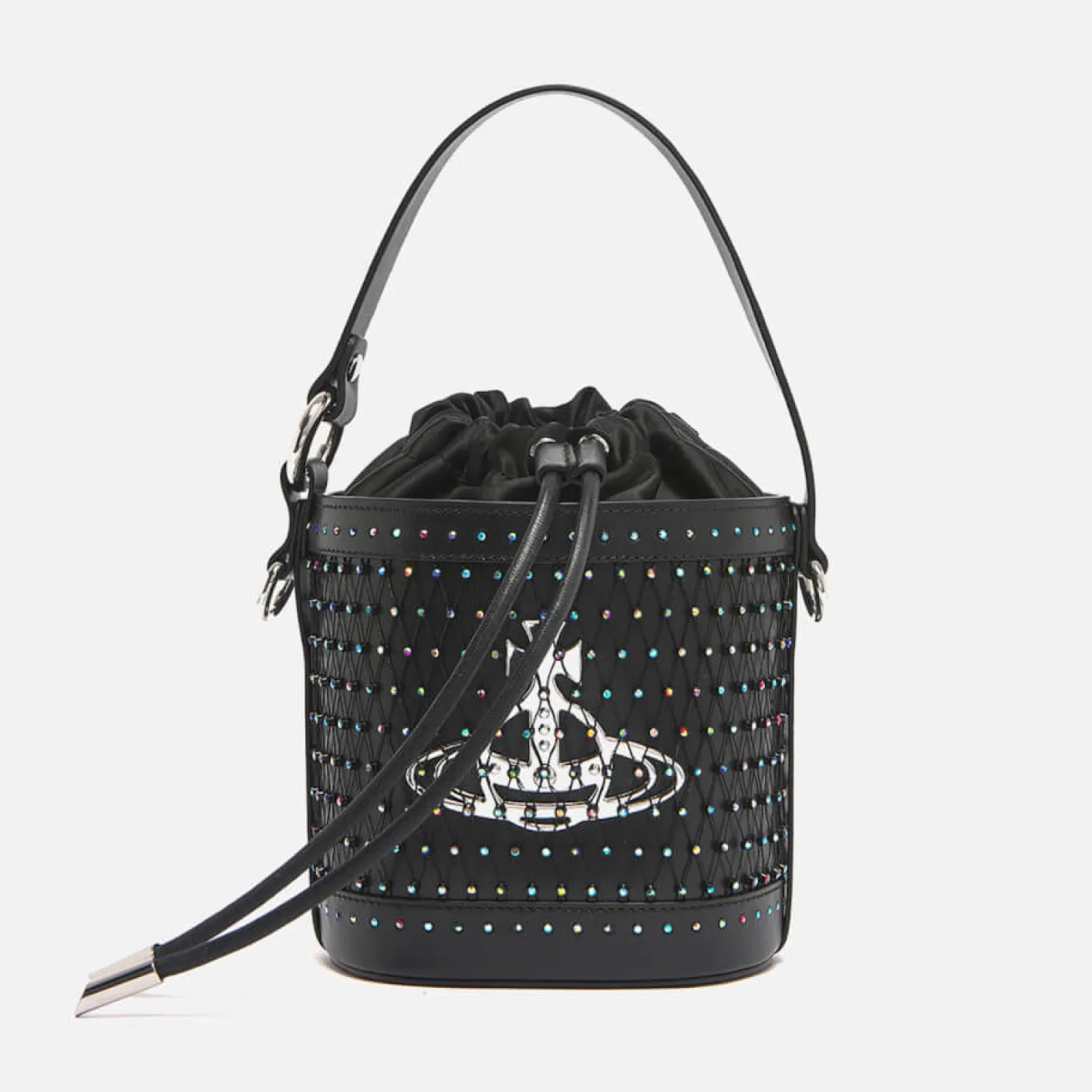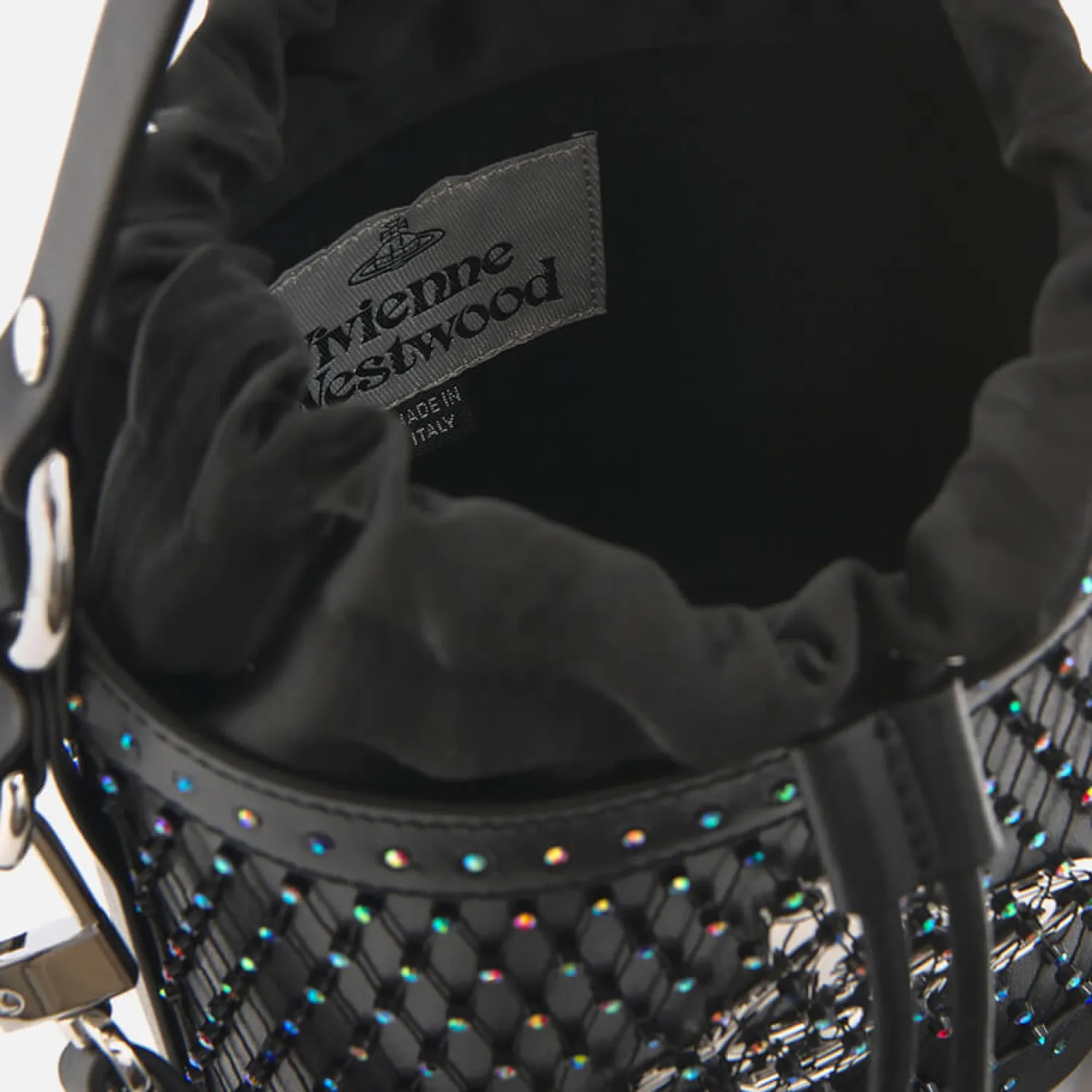 Vivienne Westwood Daisy Bucket BagBlack LeatherCrystal Net CoveringDesigner LogoTop HandleDrawstring ClosureMade In Ital…