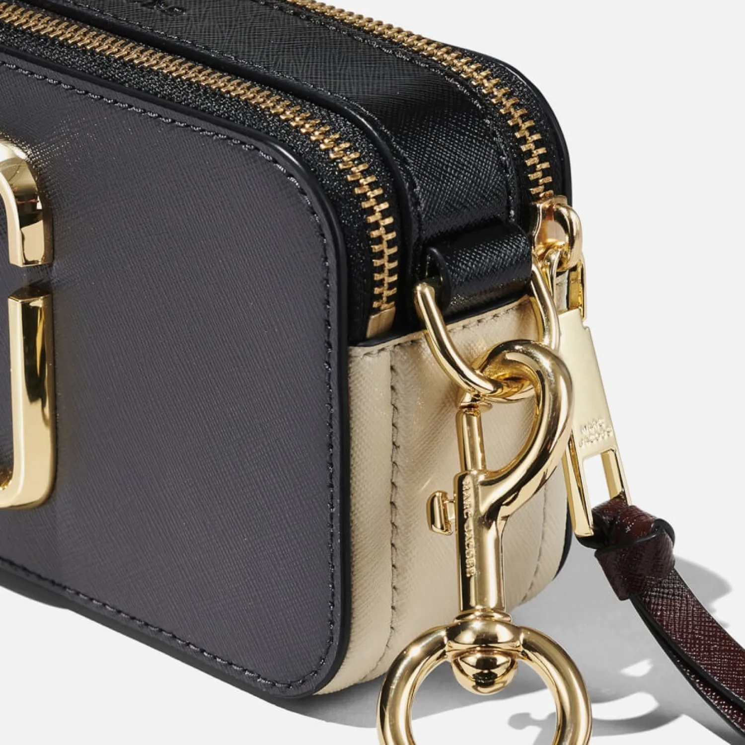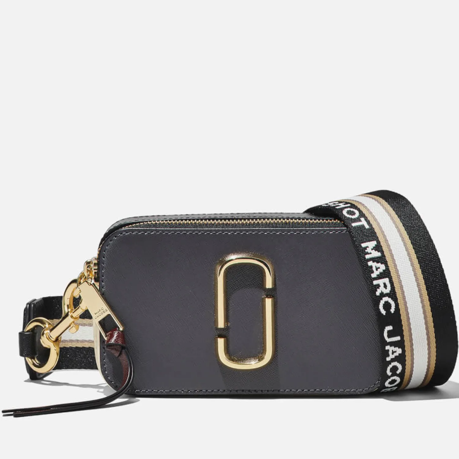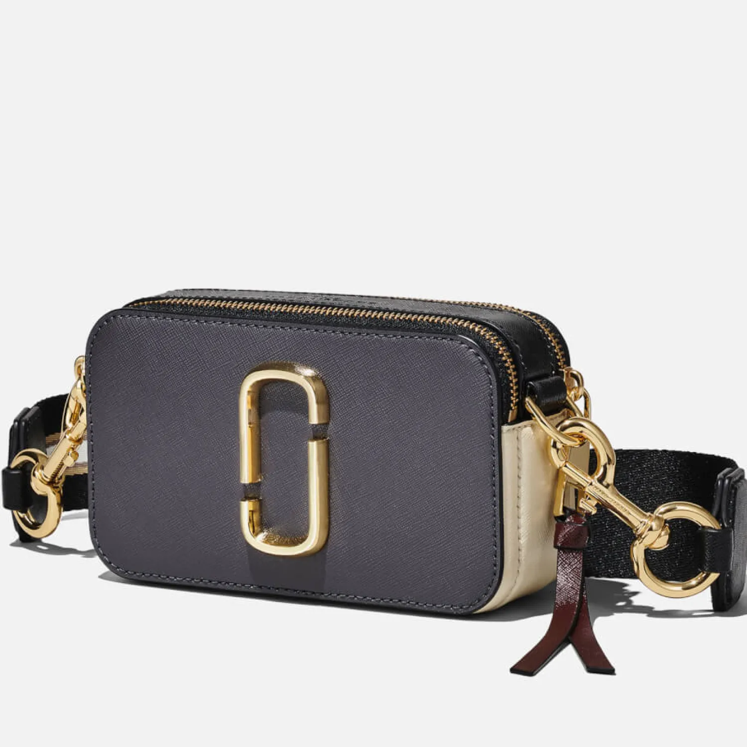 Marc Jacobs’ Bestselling Snapshot Bag Gets A Fresh Revamp In A Palette Of Deep Tones. Swathed In Charcoal Beige And Burgundy Hues The Saffiano Leather Is Crafted Into The Iconic Structured Silhouette. The Designer Plaque And Detachable Logo-Jacquard Strap Bring An Undeniable Sense Of Luxury To The Piece.