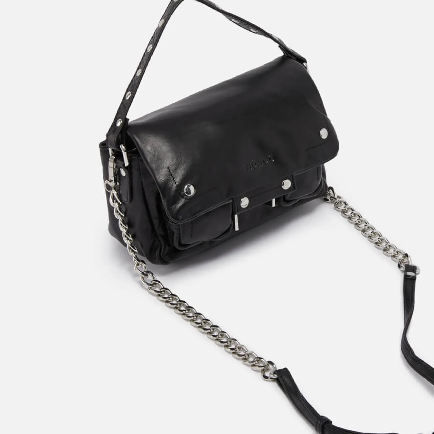 Nunoo Small Honey BagBlack LeatherOne Top HandleSilver-Toned Chain StrapExterior Zip PocketFront Flap Closure