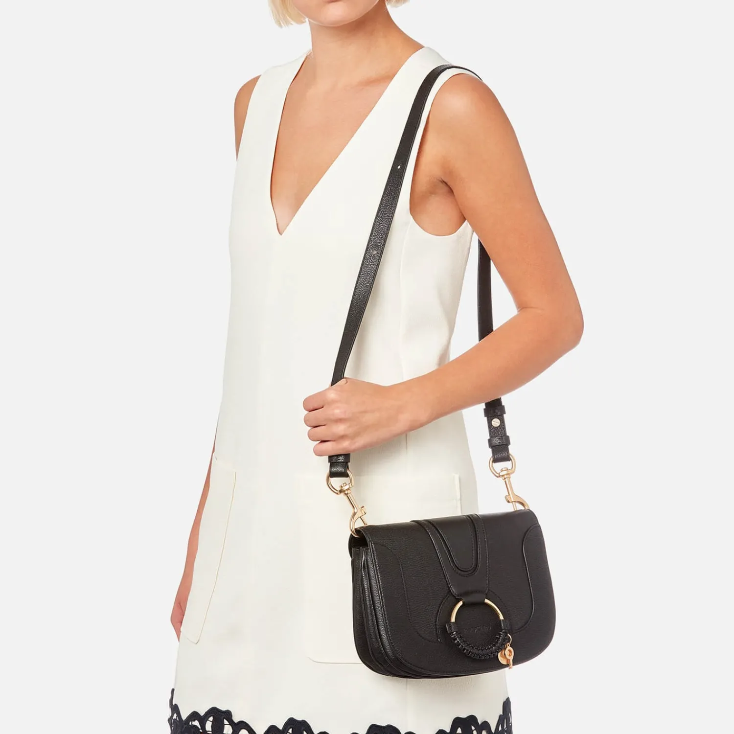Women’S Black Leather Shoulder Bag From See By Chloe. Crafted From Soft Grained Leather The ‘Hana’ Saddle Bag Comprises A Front Fold-Over Flap Secured With A Mag-Dot Fastening That Opens To Reveal A Main Compartment Divided By A Central Slip Pocket. Transported Via A Long Detachable Shoulder Strap The Bag Features An Interior Card Slot Gold-Tone Hardware And A Metal Ring Detail To The Front With A Branded Plate And Key Charm.