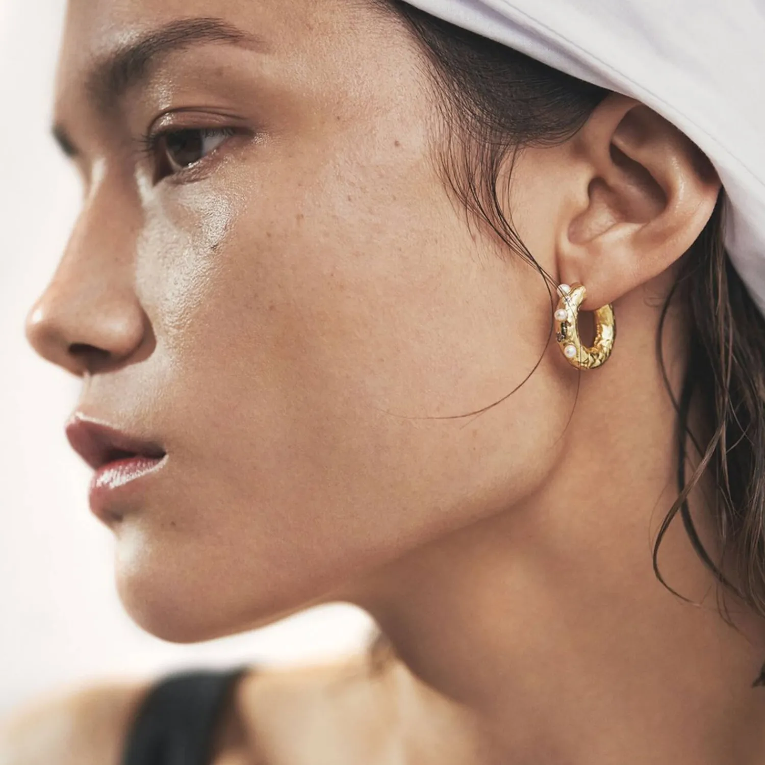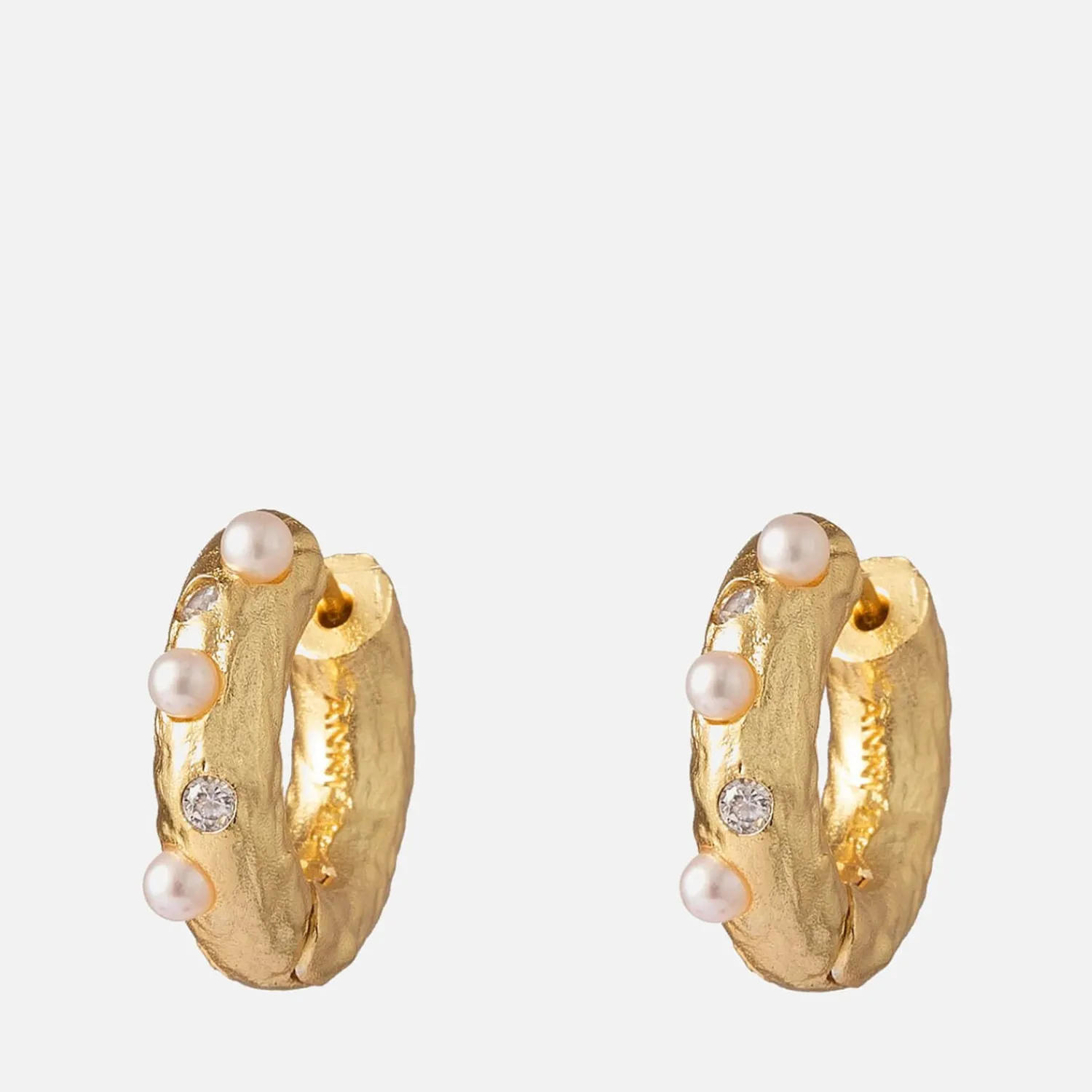 Anni Lu Gold-Tone Metal Hoops With An Organic Structure For A Vintage Look. The Pair Of Hoop Earrings Are Encrusted With Cubic Zirconia Stones And Pearl Cabochons.