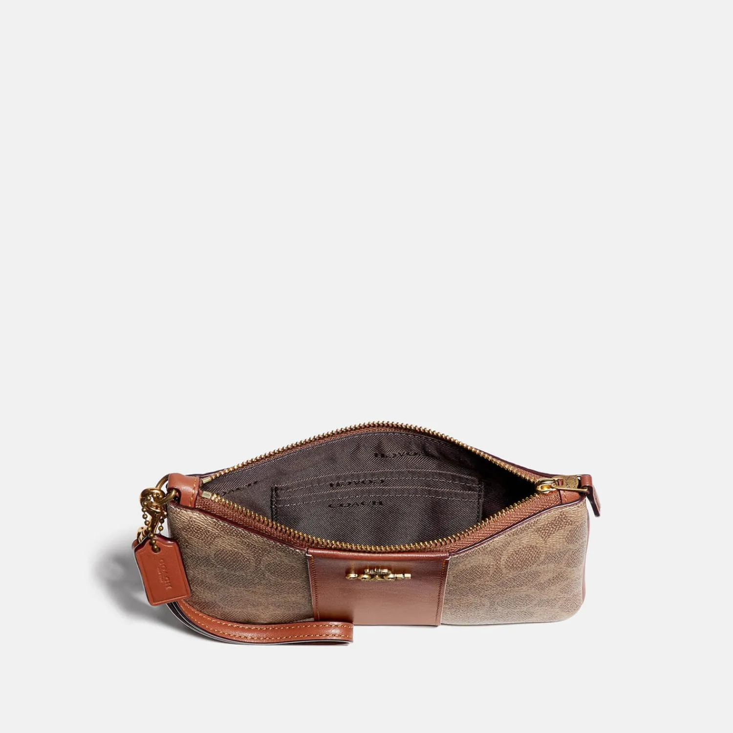 Carry Just The Essentials With This Petite Wristlet Bag By Coach. Crafted From Signature Coated Canvas With A Colourblock Leather Trim The Slender Silhouette Features Gold-Tone Hardware For Signature Polish. Wear It On Your Wrist Or Clip It Inside A Larger Bag.