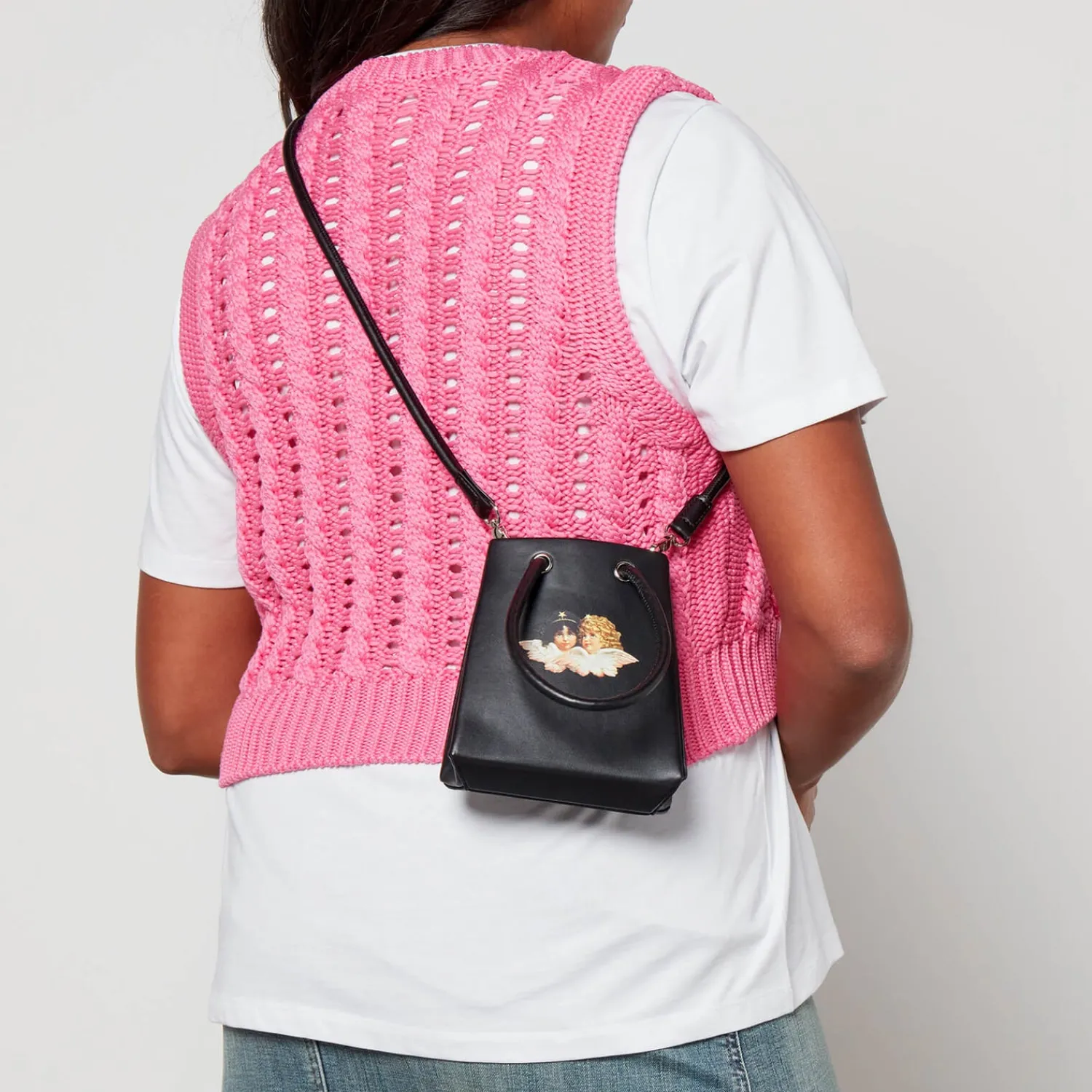 Fiorucci Icon Mini HandbagBlack Faux LeatherTop HandlesDetachable Shoulder StrapDesigner EmblemOpen Top