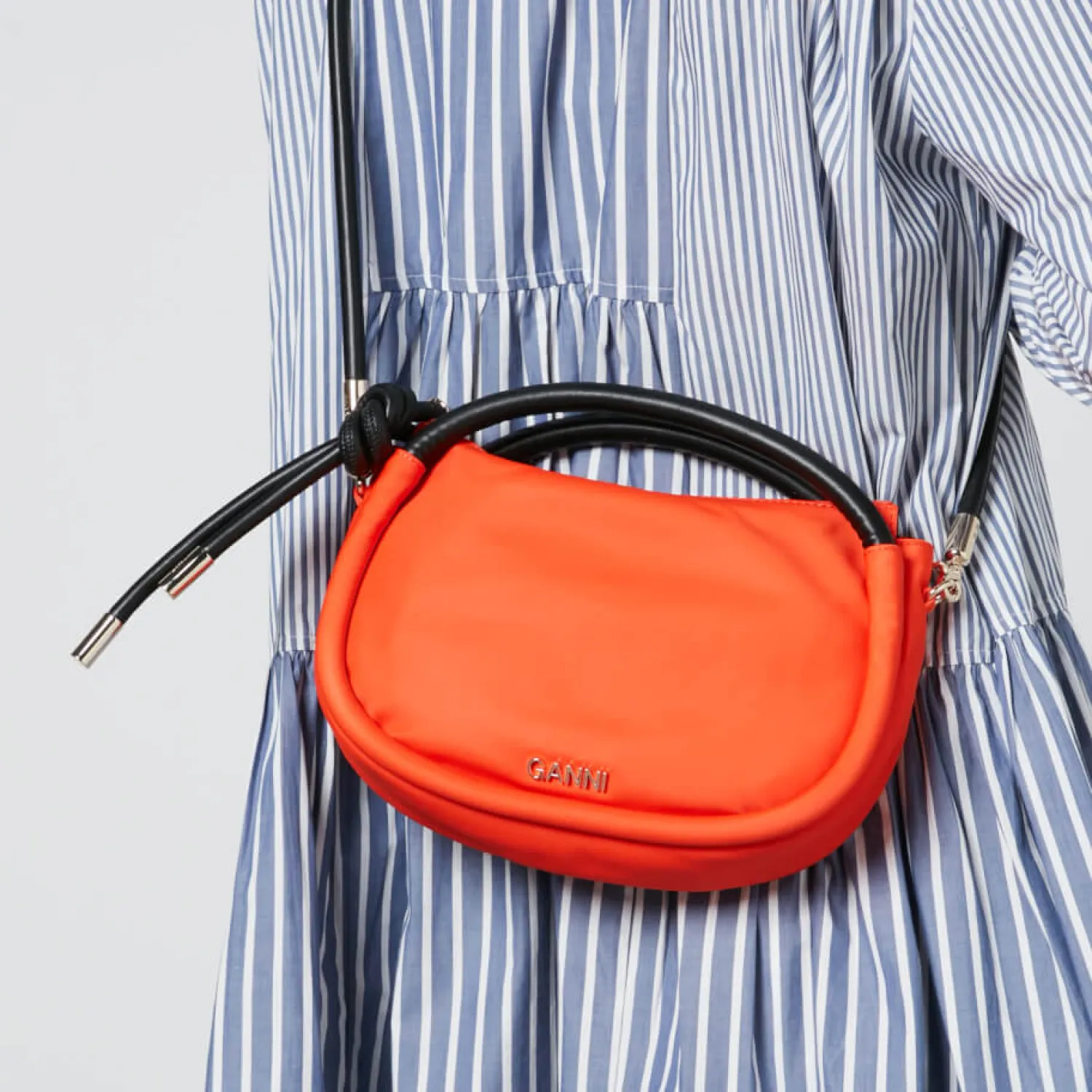 Dedicated To Being The Most Responsible Version Of Themself Ganni Presents The Mini Knot Bag Crafted From Recycled Materials. Arriving In A Blush Orange Shade The Vibrant Colourway Offers All The Drama. Defined By Its Knotted Top Handle The Statement Bag Features Subtle Branded Details With A Silver-Toned Zip Fastening.