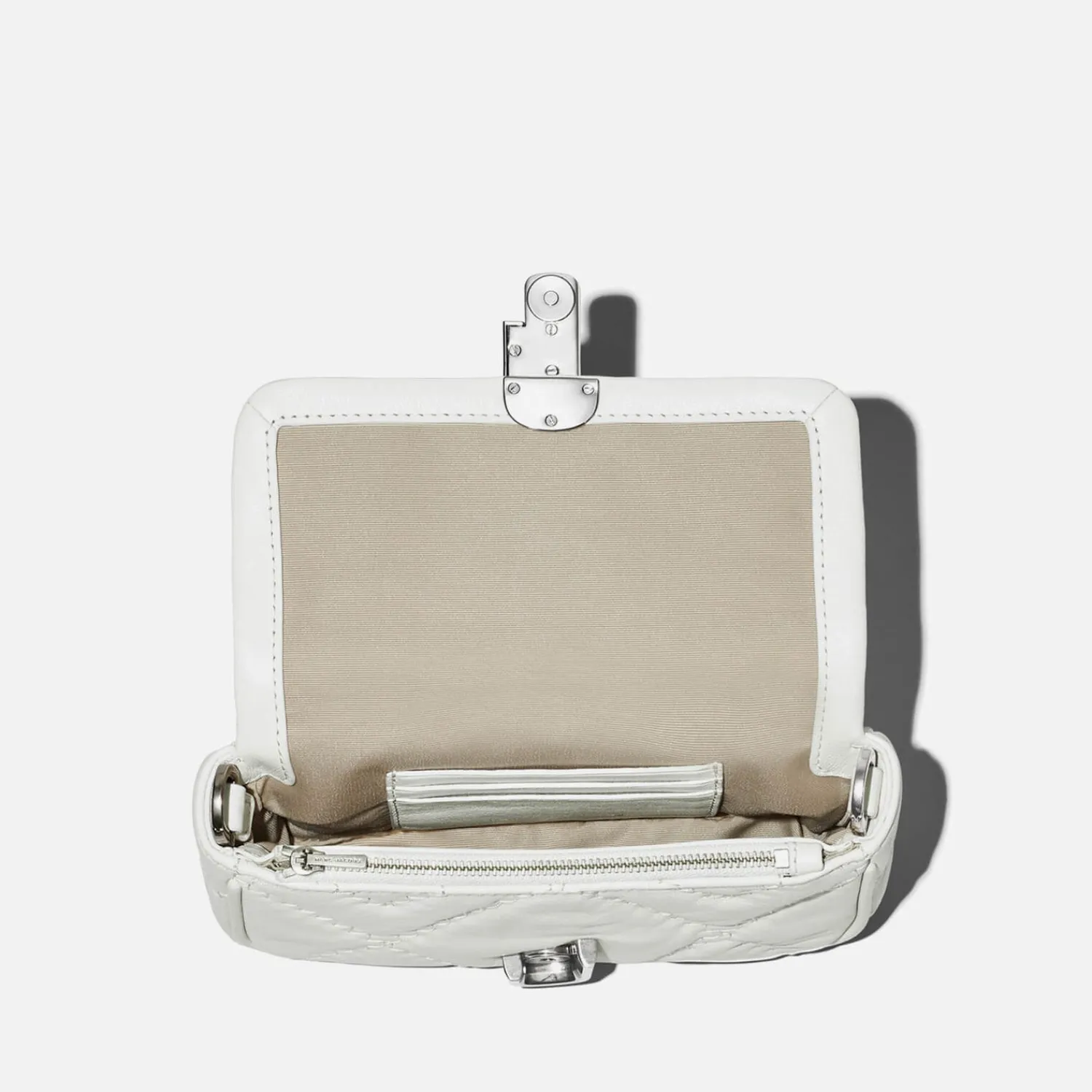 Made From Quilted White Leather Marc Jacobs’s The Mini J Marc Slips Effortlessly Over The Shoulder And Is Supported With A Chain Strap For Day-To-Night Appeal. The Double J Monogram Punctuates The Face As A Statement Sign-Off And Doubles As A Push-Lock Closure.