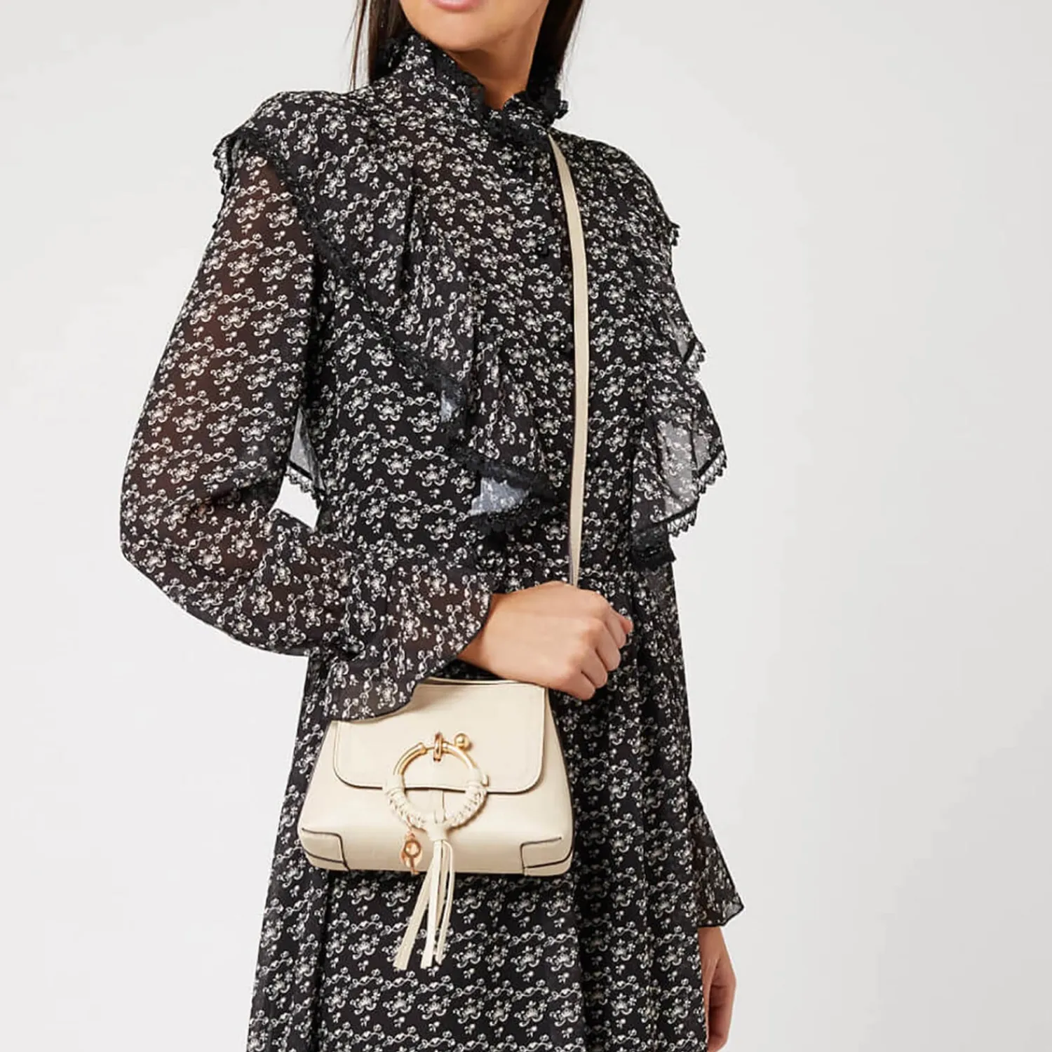 ‘Joan’ Mini Crossbody Bag From Luxury Parisian Fashion House Chloe. Known For Designs That Are Traditionally Feminine Yet Bold And Daring This Label Gives Women The Freedom To Be Themselves. Worn With Either The Long Shoulder Strap Or The Removable Lobster Clasp Grab Handle. The Trapezoid Silhouette Is Crafted From Small Grain Cowhide Leather And Secured With A Top Zip Closure. The Exposed Zip Opens To Reveal A Compact Interior Complete With Three Card Slots. Embellished With A Signature Feminine Braided O-Ring And Finished With Gold-Toned Hardware.