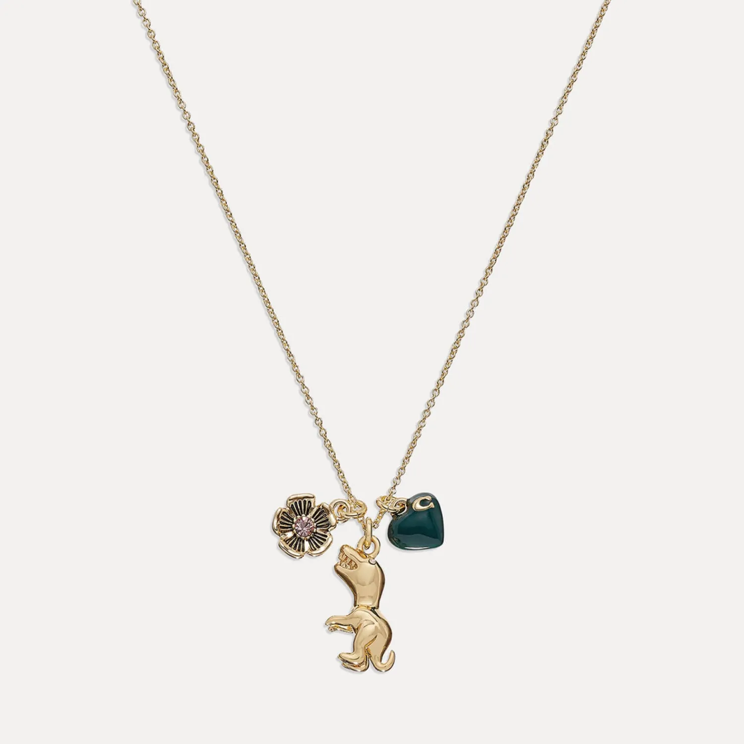 Coach Adds An Old-Age Touch To Its Sparkling Jewellery Collection By Way Of This Rexy Necklace. Set On A Dainty Chain The Design Is Finished With A Pendant Shaped Into A T-Rex Followed By A Crystal-Topped Flower And A Resin Heart.