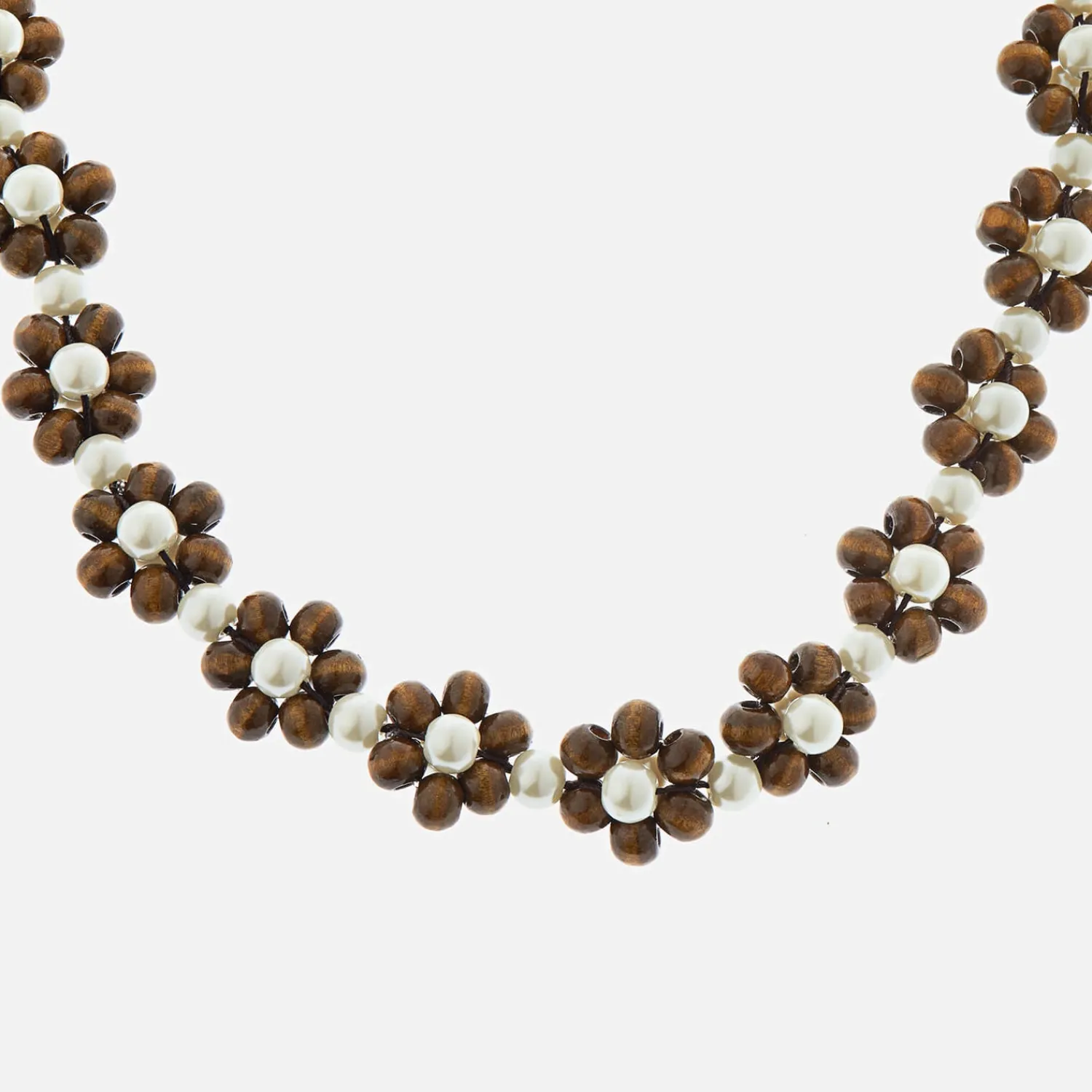 True To Form Shrimps Imparts Its Rustic And Eclectic Charm Throughout Its Aw22 Jewellery Collection Starting With The Ross Necklace. Perching High On The Neckline A Chain Of Wooden Beads Are Shaped Into A Repeat Floral Design With A Glass Pearl Centre.
