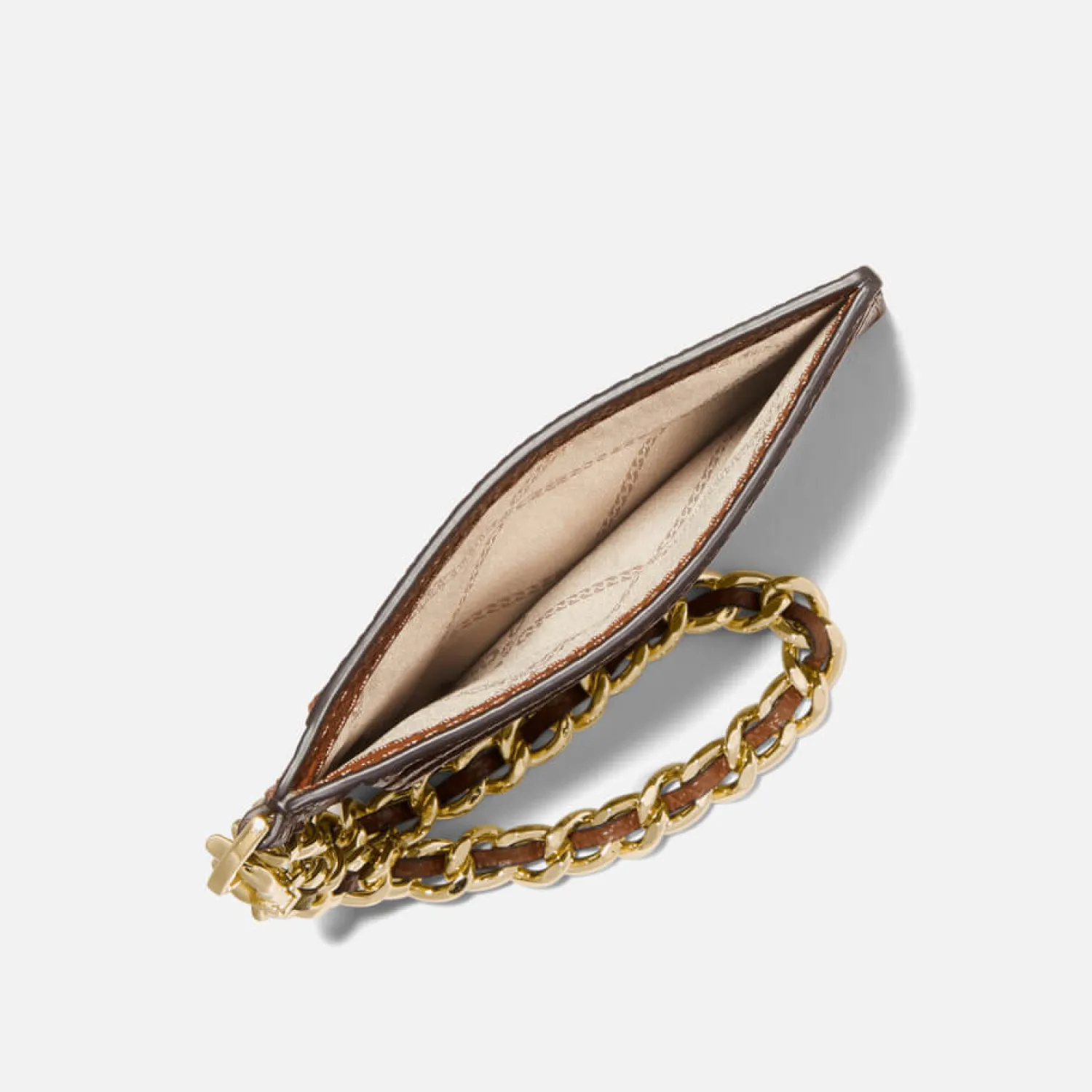 Keep Payment Essentials Stylishly Stored Via Michael Michael Kors Jet Set Charm Card Holder. Crafted From Pebbled Tan Leather The Compact Design Is Furnished With Multiple Card Slots And Is Attached To A Woven Gold-Tone Wrist Loop For A Touch Of Functional Glamour.