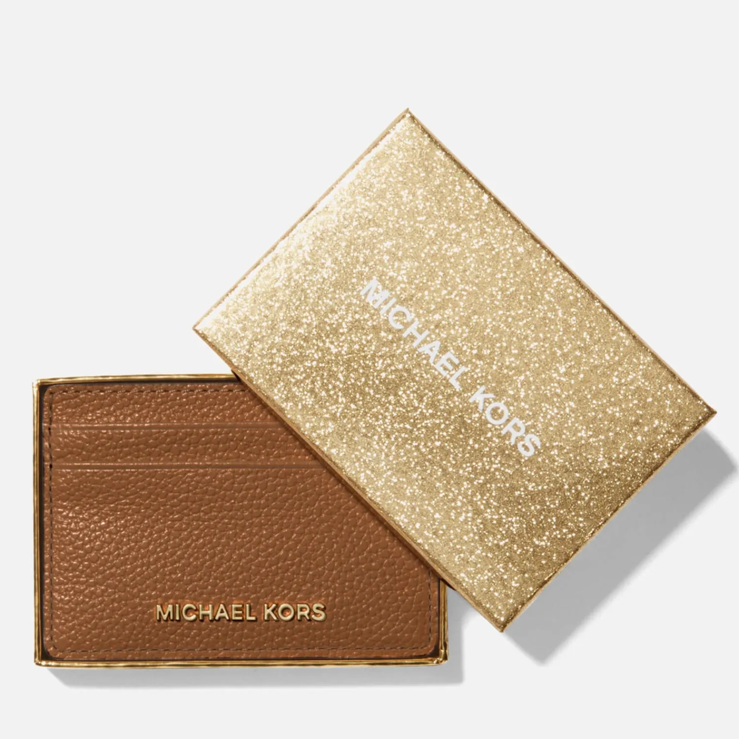 ‘Jet Set’ Card Holder From Michael Michael Kors. Crafted From Calf Leather. Embellished With 3D Logo Lettering In Gold-Tone Metal. Two Card Slots. Logo Printed Grosgrain Lining.