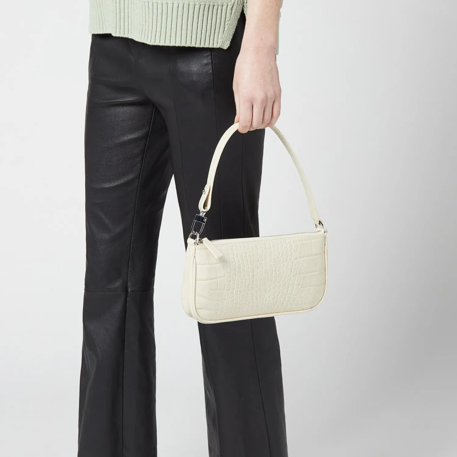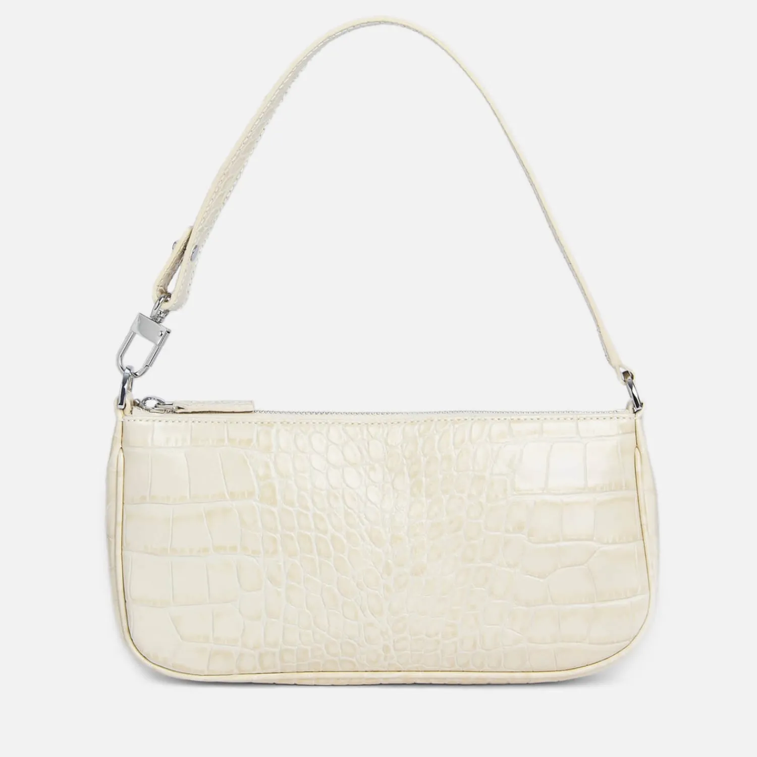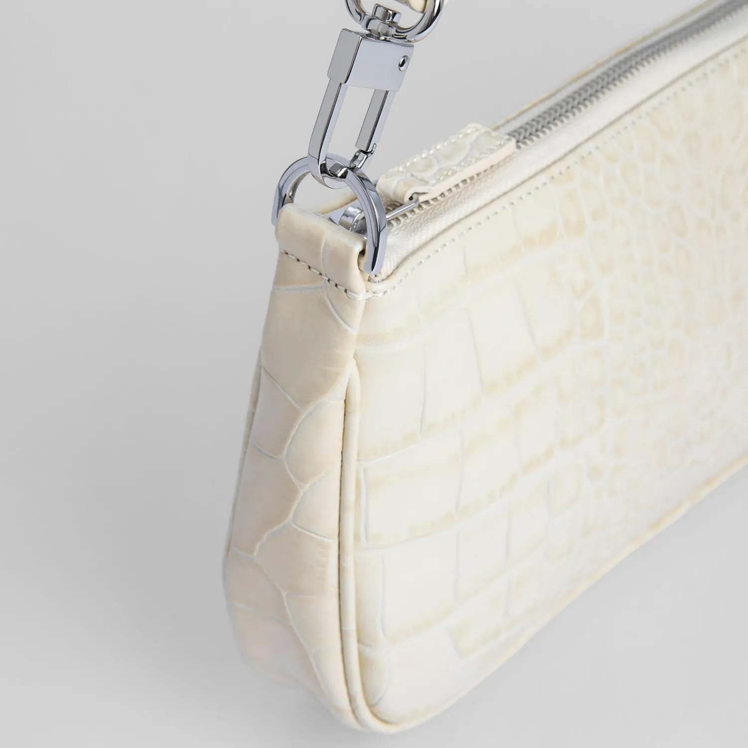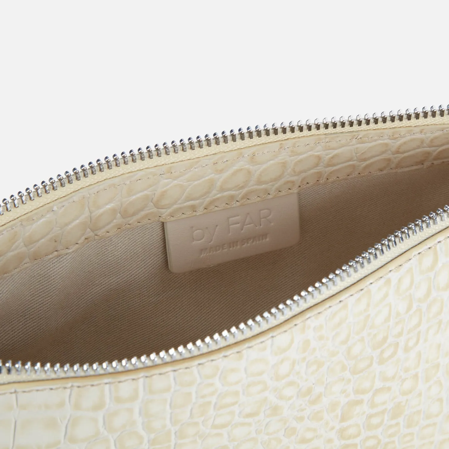 By Far’S ‘Rachel’ Handbag Is Crafted From Cream Leather With A Croc-Embossed Design. The Slim Strap Is Fastened Using Silver Tone Hardware To Match The Zip Top Opening Which Reveals One Internal Compartment Lined With Cotton. A Logo Panel Features Inside.