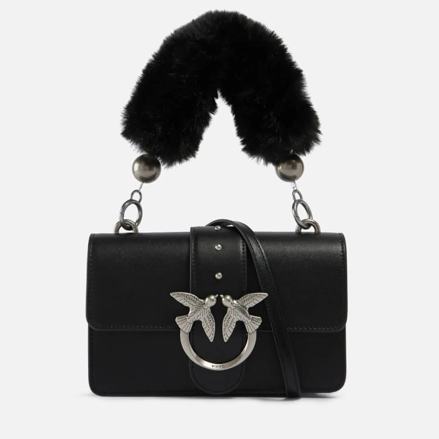 Pinko Love Mini Icon Shoulder BagBlack Leather And Faux FurAdjustable Shoulder StrapDetachable HandleDesigner PlaqueSilv…