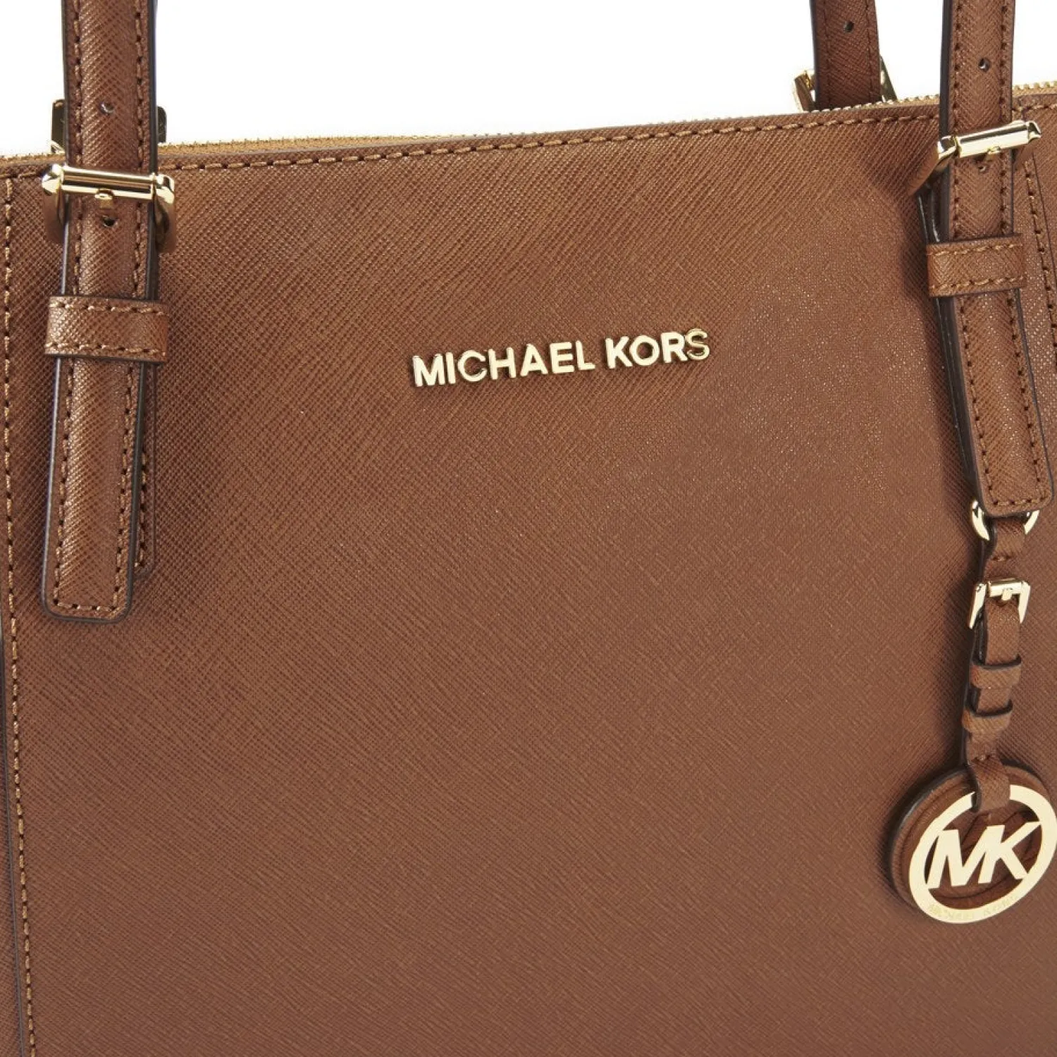 Women’s Tan Tote Bag From Michael Michael Kors With Saffiano Leather Construction And Structured Silhouette. The ‘Jet Set’ Bag Features Lateral Pockets To The Exterior For Extra Storage And A Top Zip Fastening That Opens To Reveal A Fabric Lined Interior With Multiple Zip And Slip Pockets Within. Complete With Two Flat Shoulder Straps Gold Toned Buckle Detailing And Protective Metal Feet To The Base. Applique Branding To The Front And Signature Charm. – K.N.