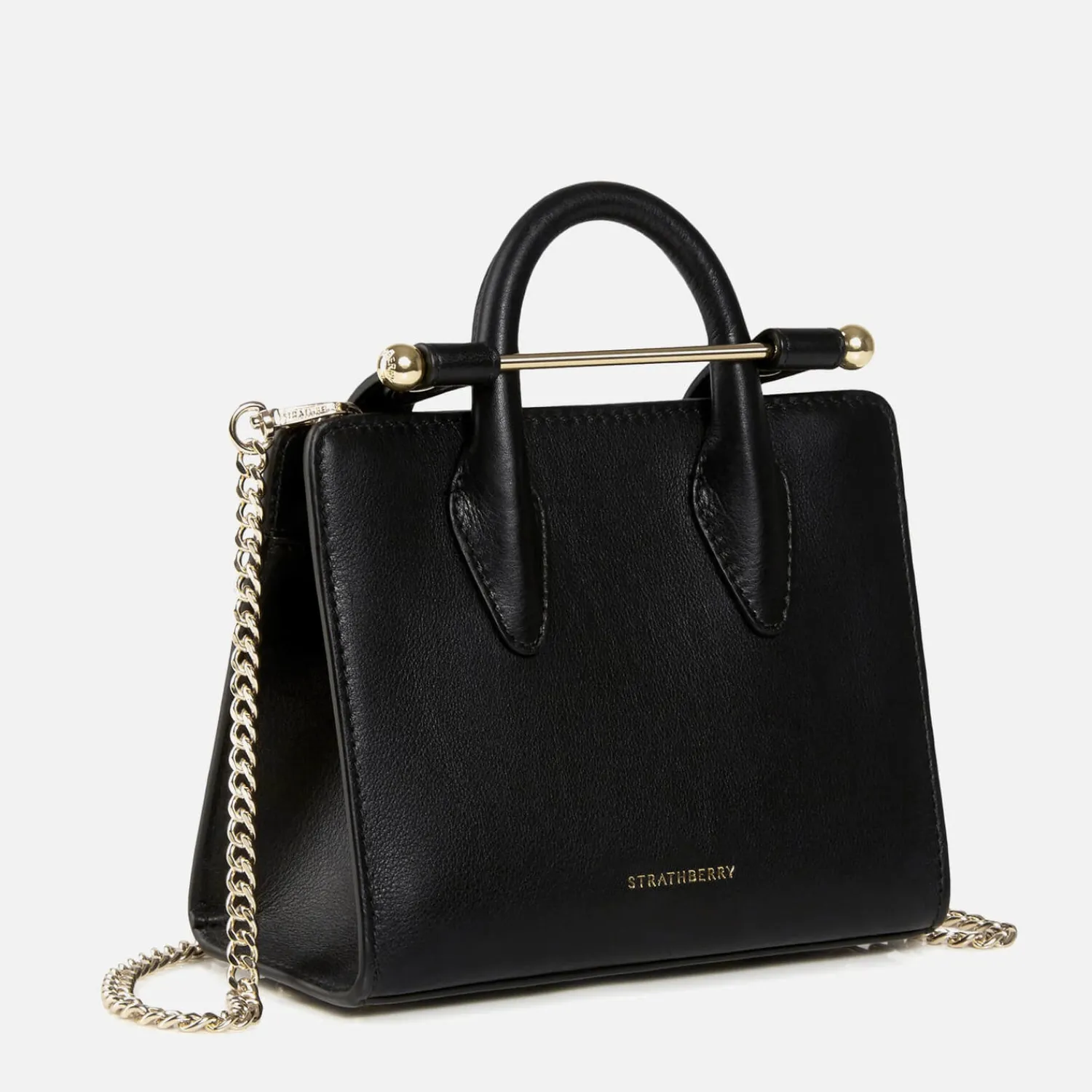 Strathberry Presents The Nano Tote Bag. Sporting The Label’S Signature Style The Design Is Distinctly Minimalist Imagined With Clean Lines And An Understated Colour Palette. This Architectural Simplicity Is Enlivened By Gold-Tone Hardware Giving Colour To The Brand’S Signature Bar Closure As Well As The Curb Chain Strap. These Metallic Details Give The Bag An Edge While Tonally Matching The Embossed Logo Lettering. Carried By The Dainty Rolled Top Handles Or Removable Strap The Bag Can Be Worn Across The Body Over The Shoulder Or Held In The Hand.