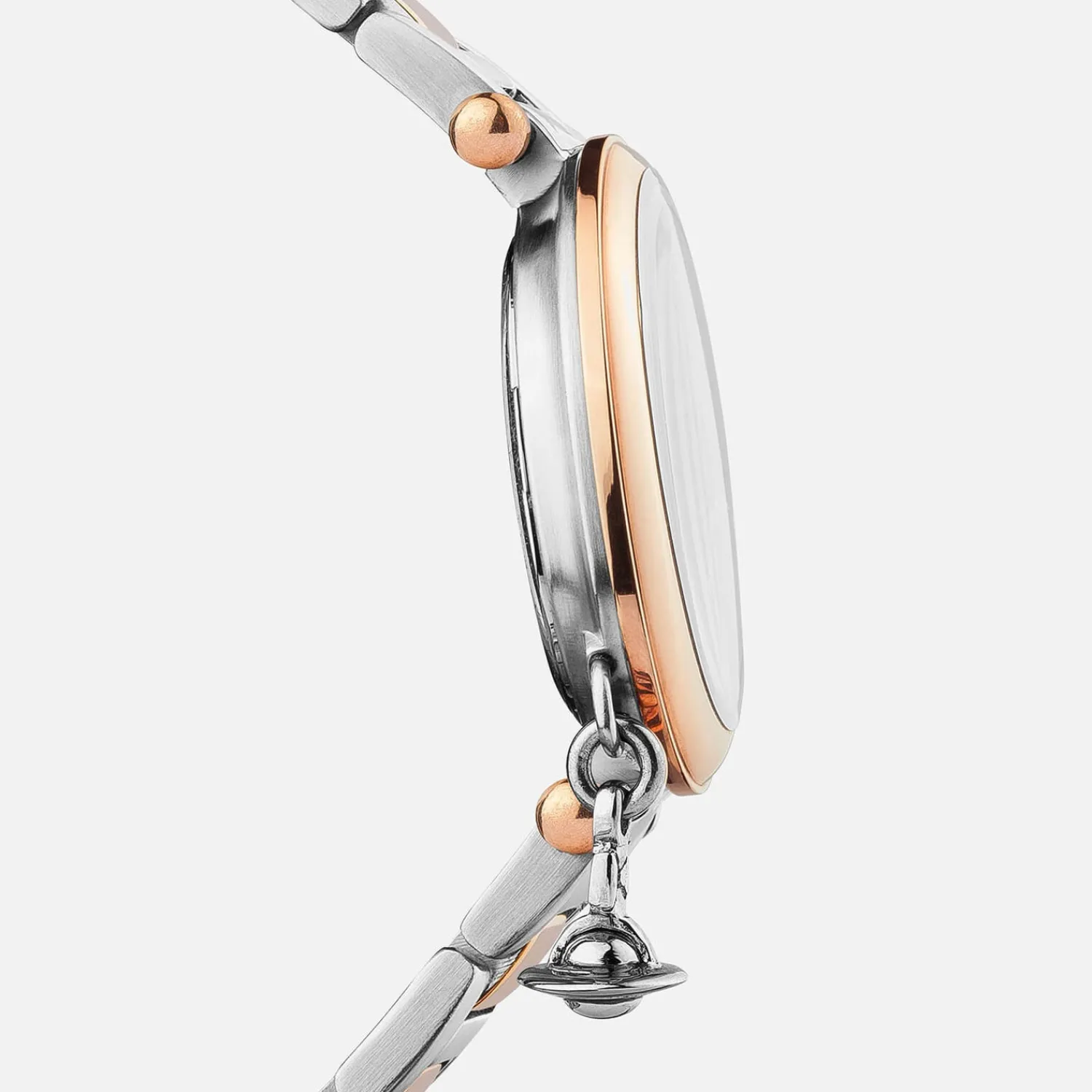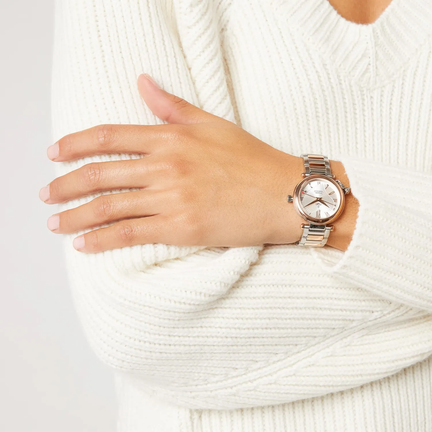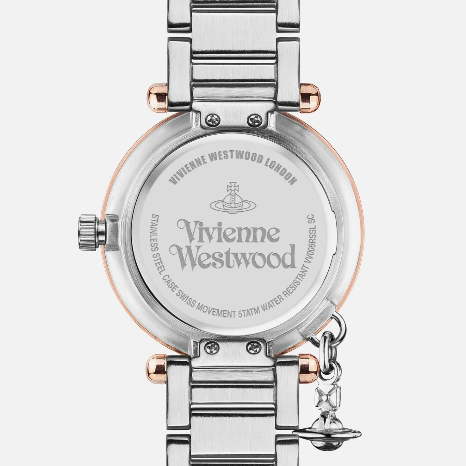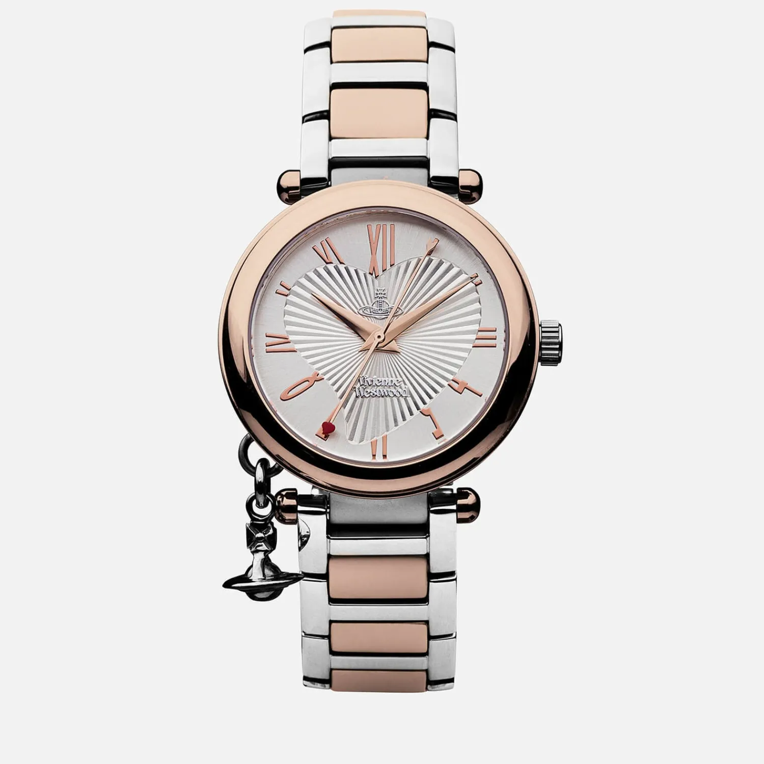 Vivienne Westwood Watch With A Two-Tone Silver And Rose Gold Design. The Round ‘Orb’ Watch Is Decorated With Vivienne Westwood’S Signature Orb Logo Charm Hanging From One Side An Arrow-Shaped Second Hand And Textured Heart Detail. Designed With A Swiss Movement The Watch Is Finished With A Two-Tone Bracelet Strap Signature Branding On The Face And A Blend Of Roman Numeral And Arabic Hour Markers. Presented In A Vivienne Westwood Gift Box.