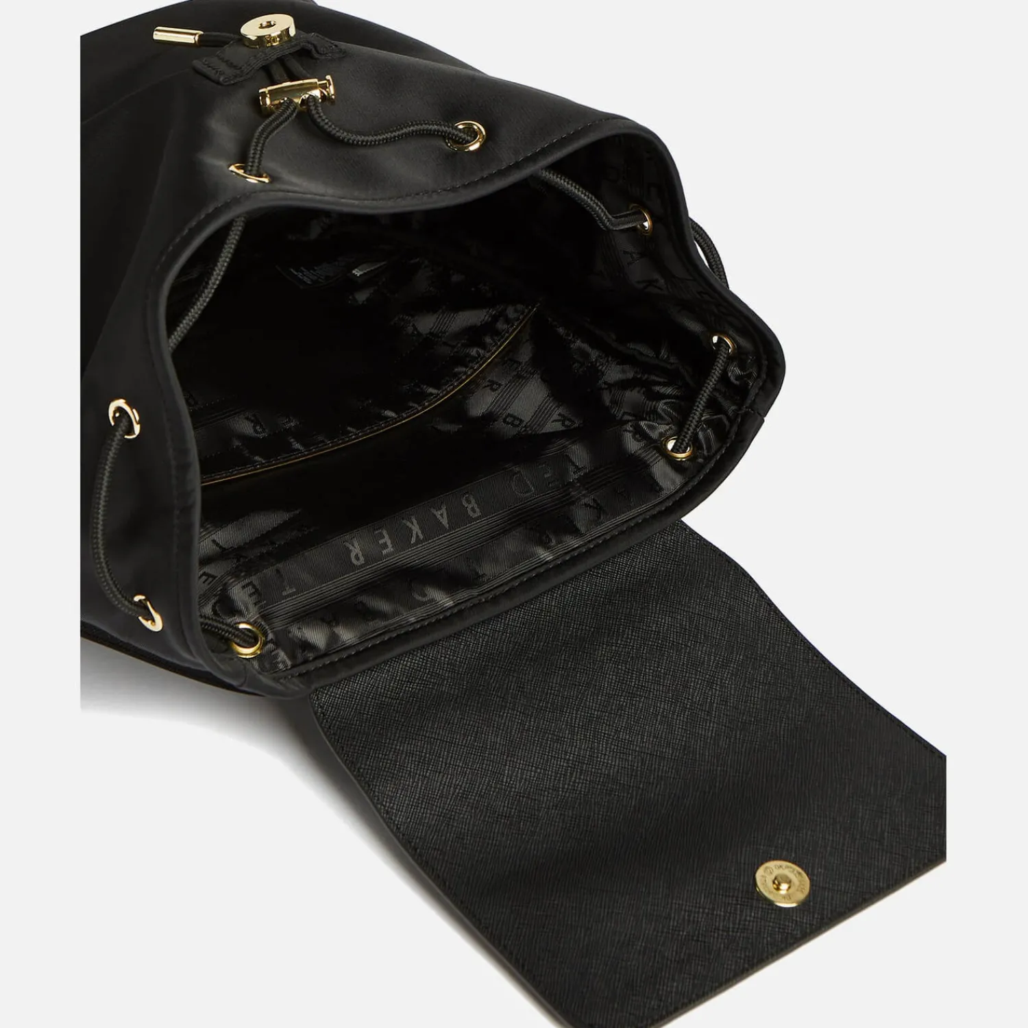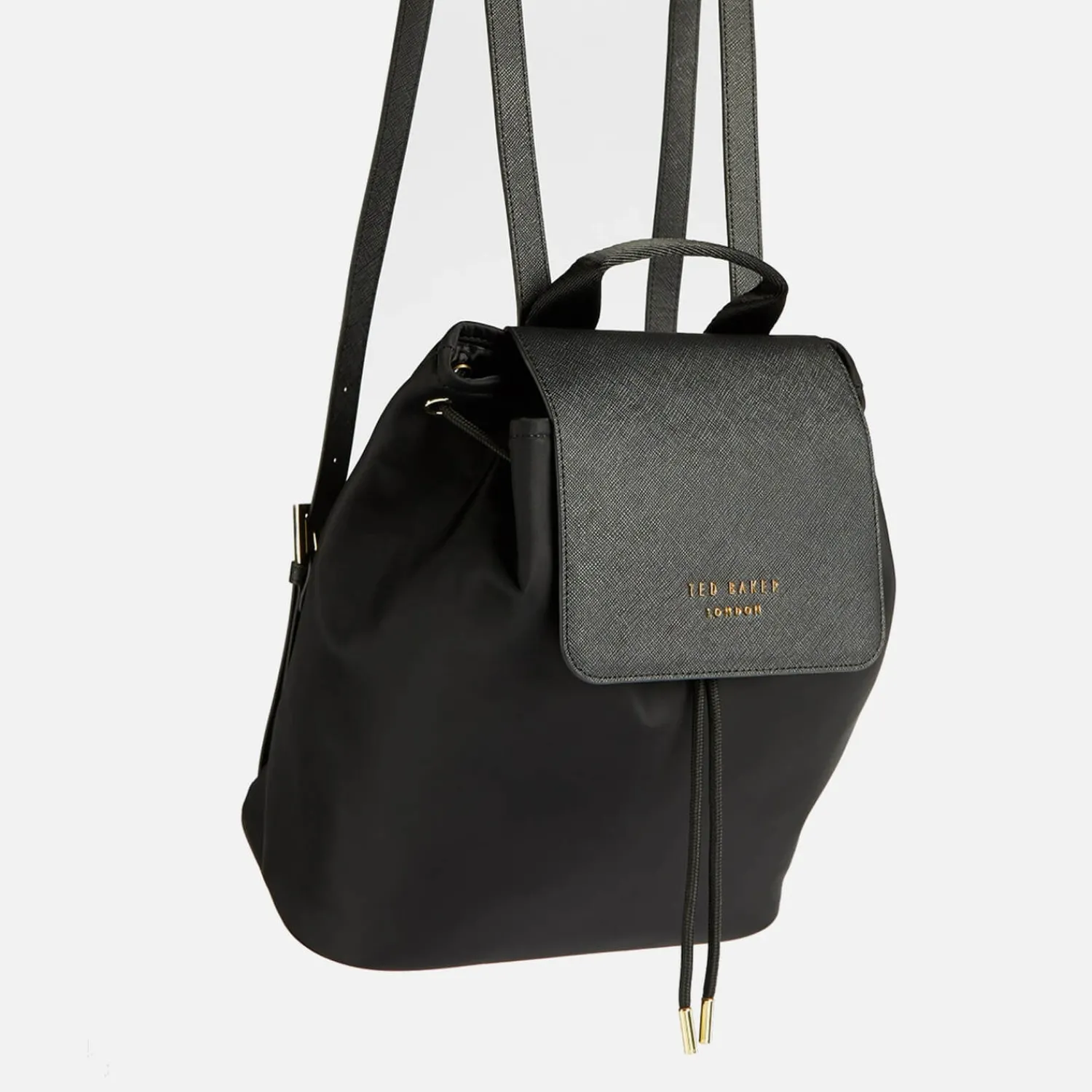 The ‘Naome’ Backpack Is Designed With Ted Baker’S Classic Elegance In Mind. Made From Nylon The Black Bag Has A Sleek Yet Durable Finish. A Drawstring Fasten Keeps The Fully Lined Main Compartment Secure. The Top Handle Is Joined By Fully Adjustable Shoulder Straps. Finished With Gold-Tone Brand Lettering To The Front.