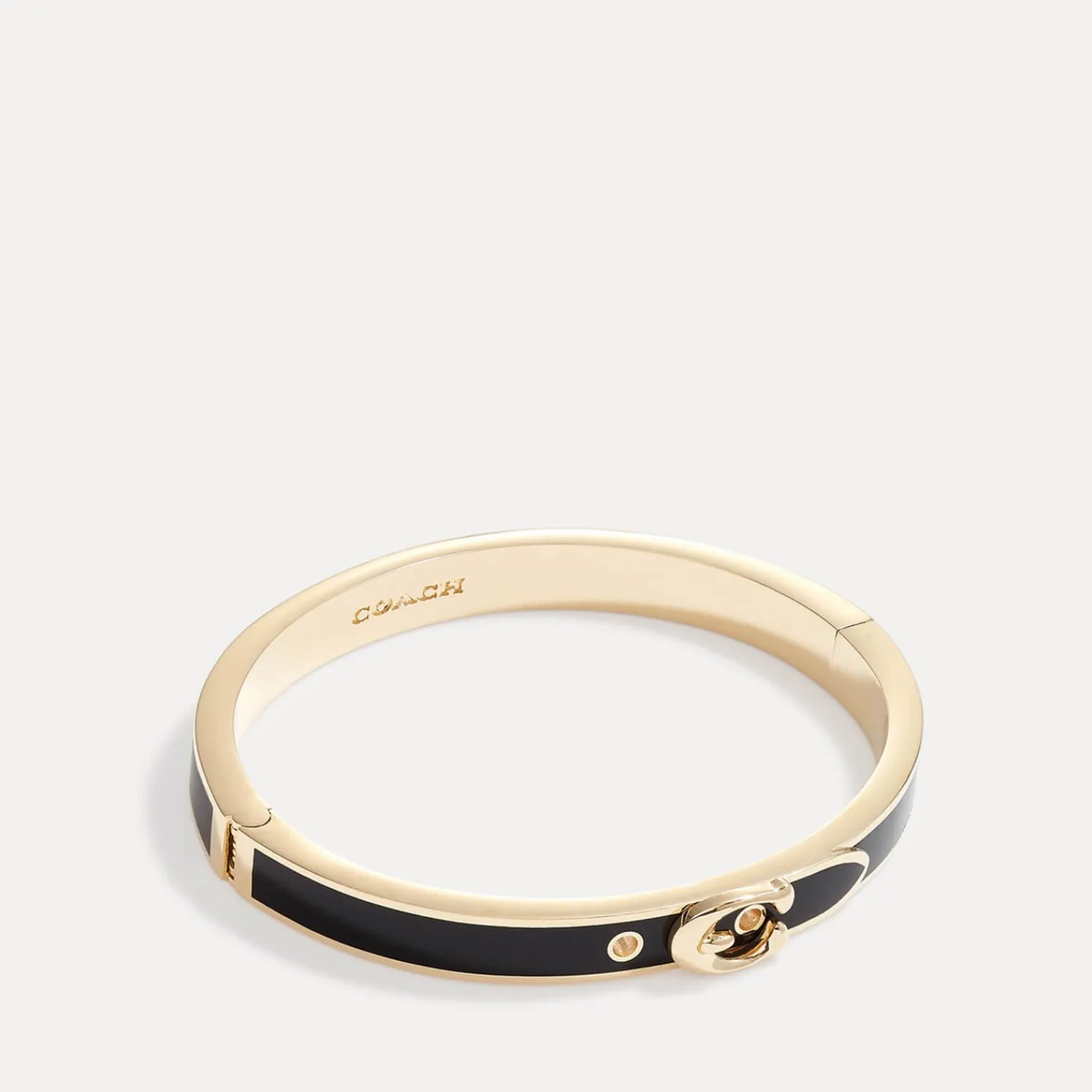 Sleek And Stackable Coach’s Buckle Bangle Is Made From Gold-Tone Brass With Black Enamel Coating. In Keeping With The Label’s Logo-Centric Designs The Coveted C Monogram Sits At The Centre And Doubles As A Clip Fastening.