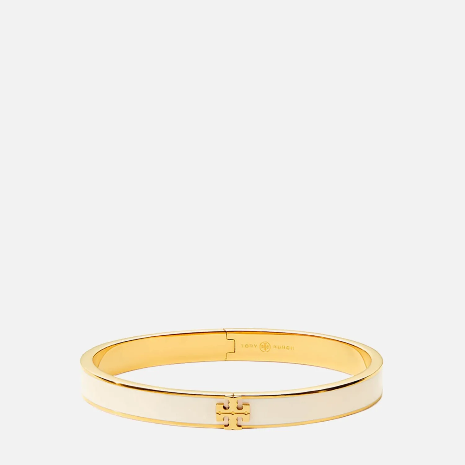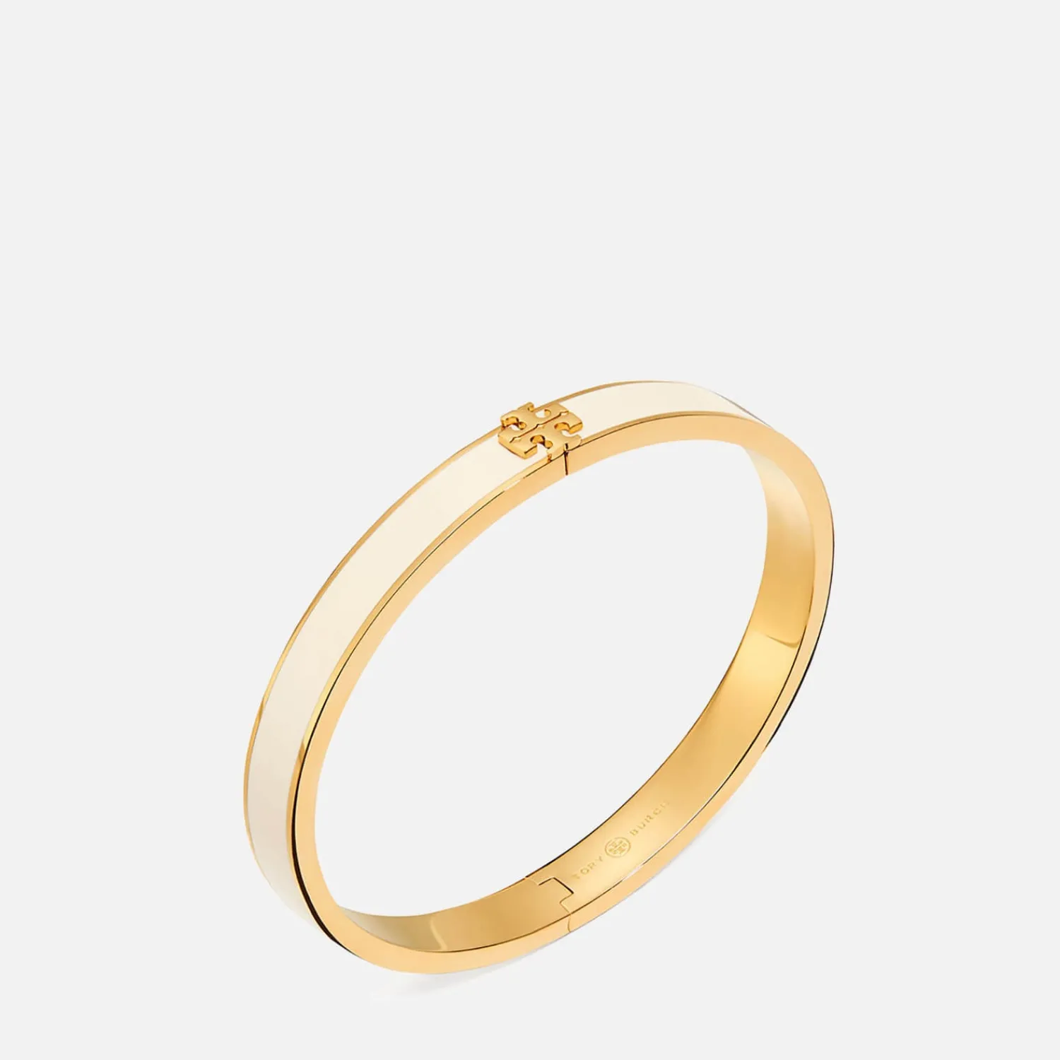 Elegantly Embossed With Double T Hardware This Bracelet Is Undoubtedly Tory Burch. Cast From 18-Karat Gold-Plated Brass The Slim Bangle Is Complemented By Smooth Enamel For New Levels Of Depth And Warmth. Hinged At The Signature Motif The Structured Piece Securely And Effortlessly Clasps To The Wrist.