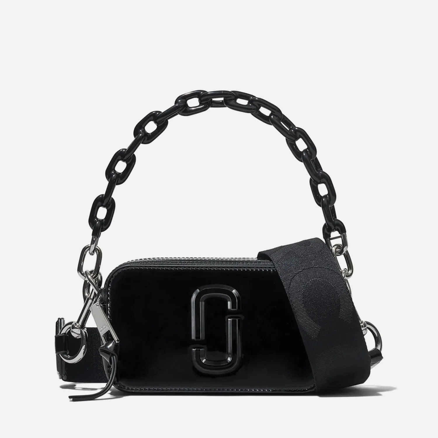 Marc Jacobs’ Iconic Coveted Snapshot Gets A Punk Overhaul For Ss23. Made From Glossy Patent Leather The Design Features The Signature Double J Monogram And It Topped With A Black Chain Handle. A Branded Cross-Body Strap Completes The Design For Hands-Free Styling.
