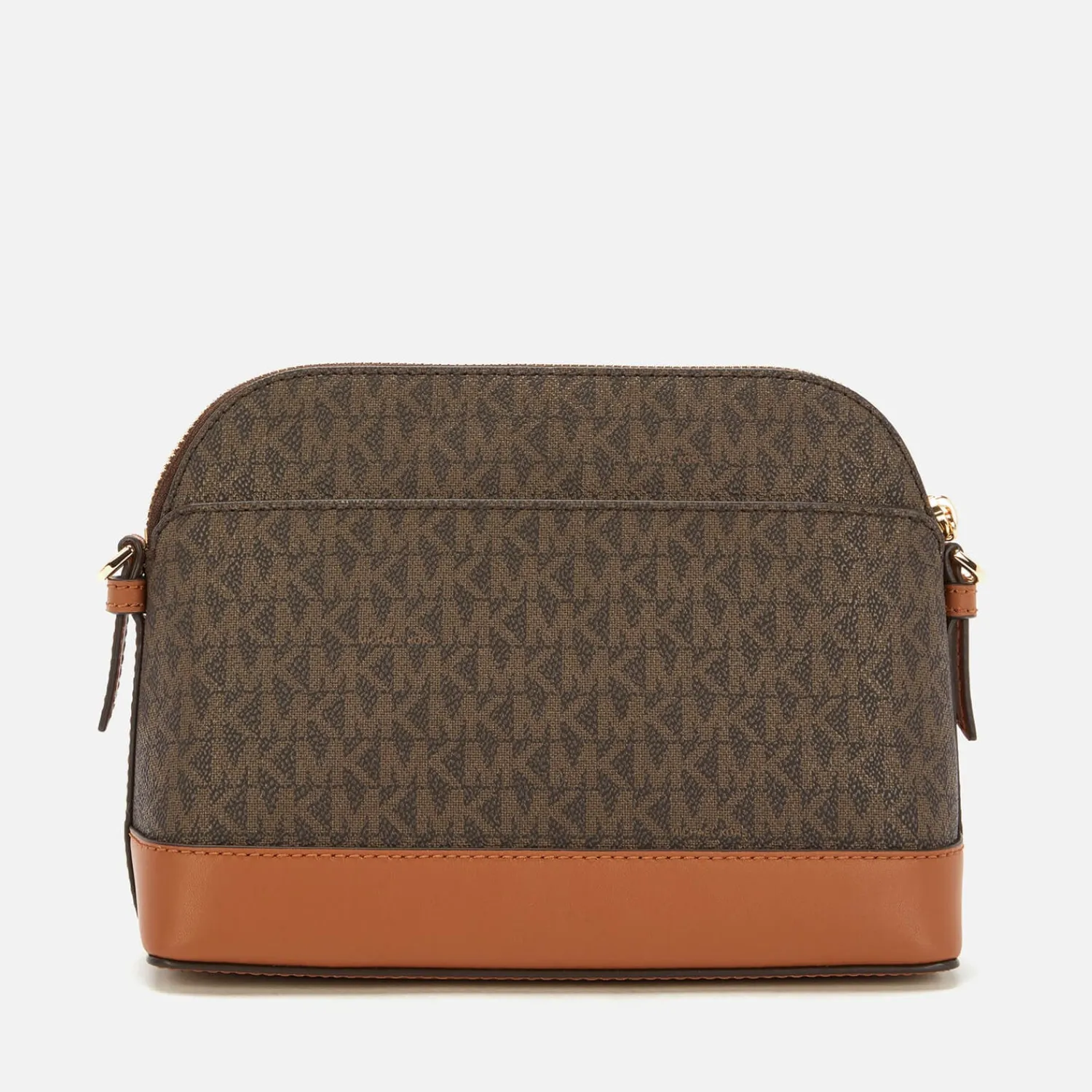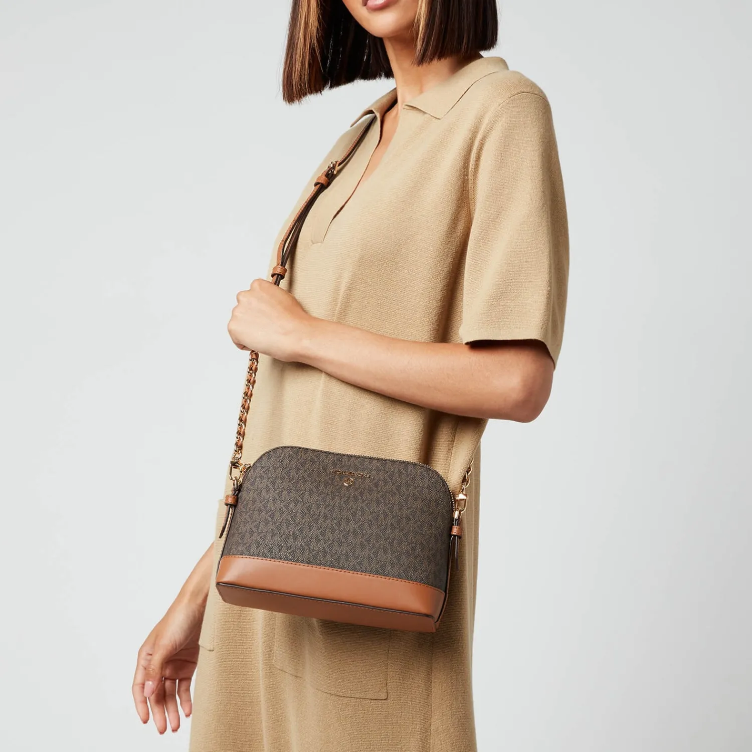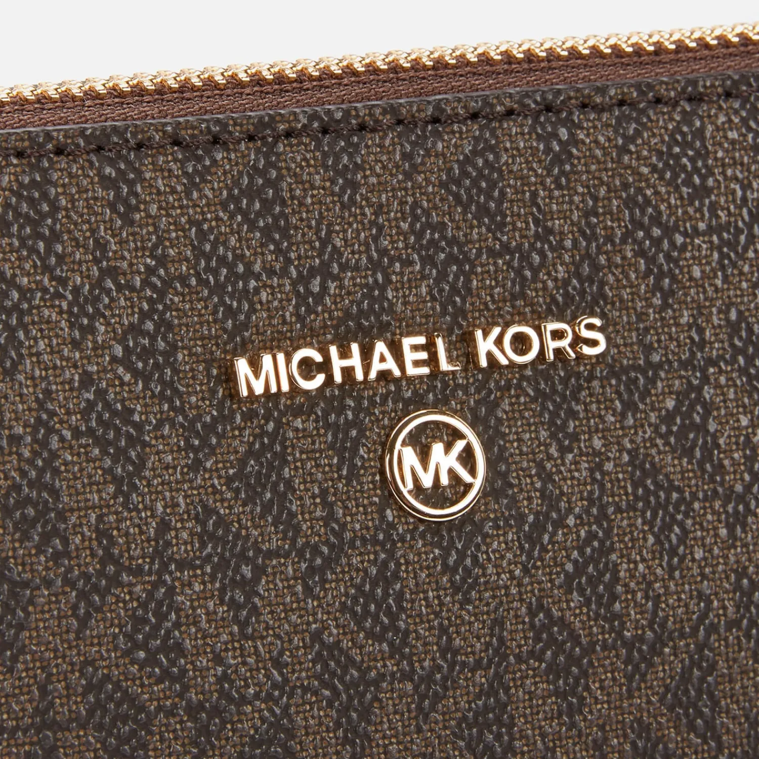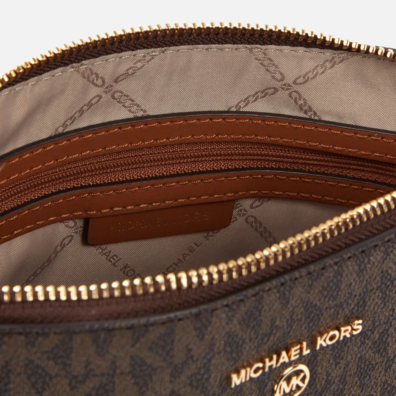Bring A Signature Accent To Any Look With Michael Michael Kors’ Jet Set Charm Cross-Body Bag. Sporting A Curved Design It’S Made From The Brand’S ‘Mk’ Monogrammed Jacquard And Trimmed With Smooth Faux Leather. The Roomy Silhouette Has An Internal Pocket And Is Carried By A Chain Detailed Strap.