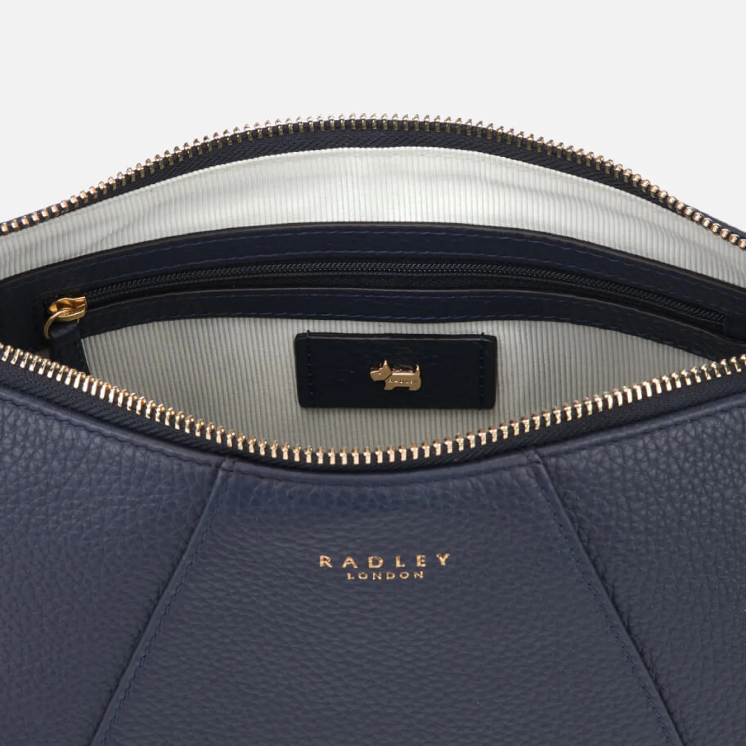 ‘Wood Street’ Cross Body Bag In Textured Leather From Radley. The Blue Shoulder Bag Opens With A Top Zipper To Reveal A Compact Interior With A Grosgrain Lining And Zip And Slip Pockets. A Further Pocket Features To The Reverse Of The Structure While A Detachable Adjustable Shoulder Strap Offers Multiple Styling Options. Gold Foil Branding And A Signature Dog Charm Add The Finishing Details.