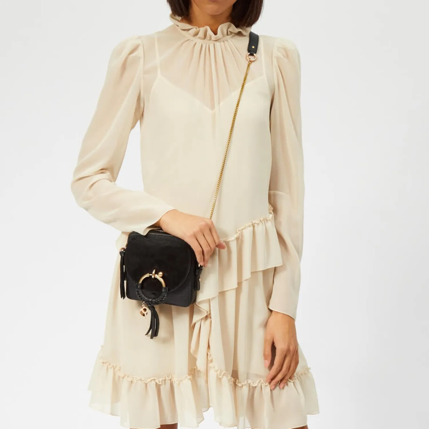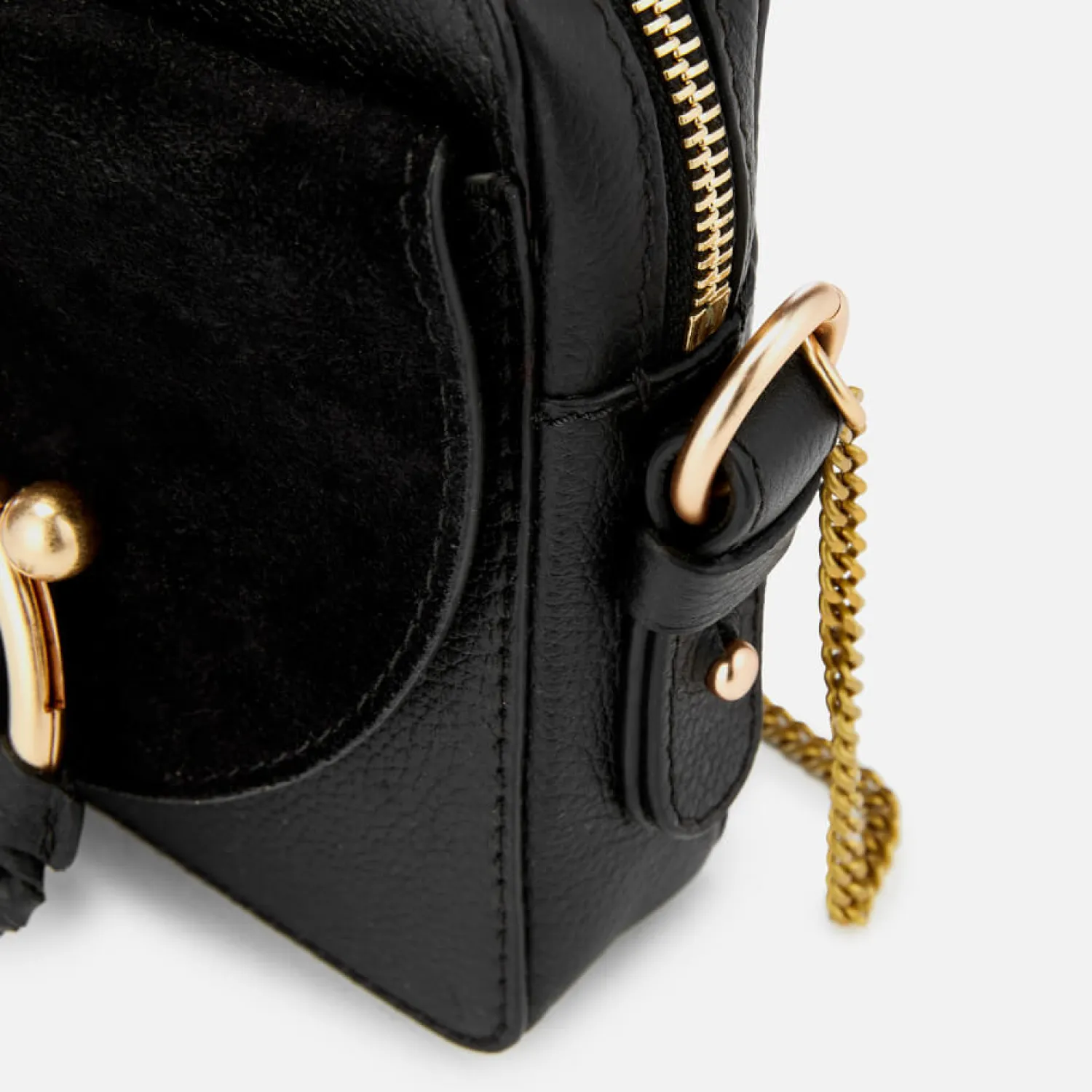 Presented In Textured Leather And Smooth Suede The ‘Joan’ Cross Body Bag From See By Chloe Features A Zip Fastening And A Lined Interior With Leather Card Slot. The Black Camera Bag Features A Chain And Leather Strap And A Magnetic Flap Pocket To The Front With Ring And Tassel Detail. A Metal Logo Charm Completes The Design.