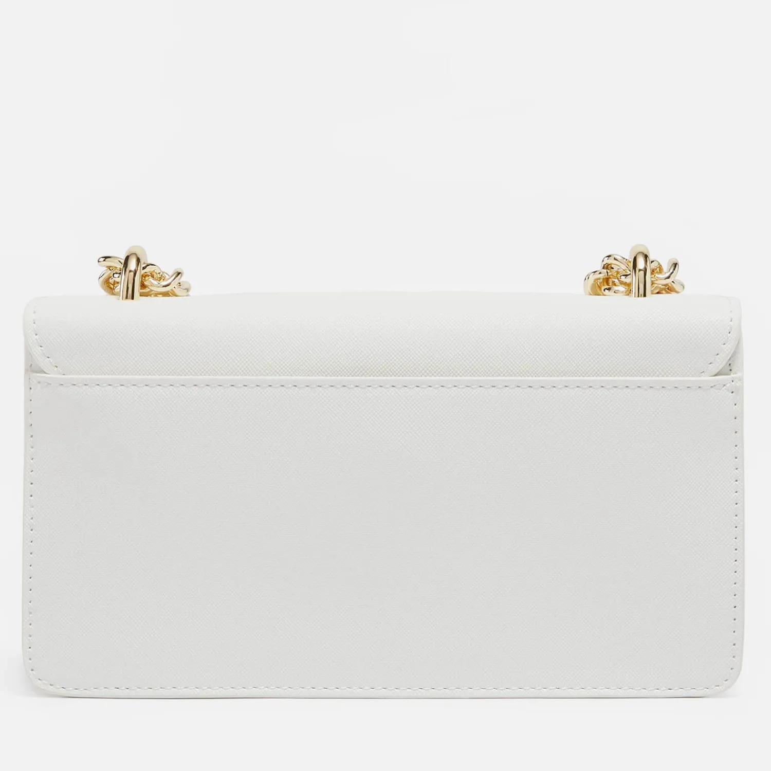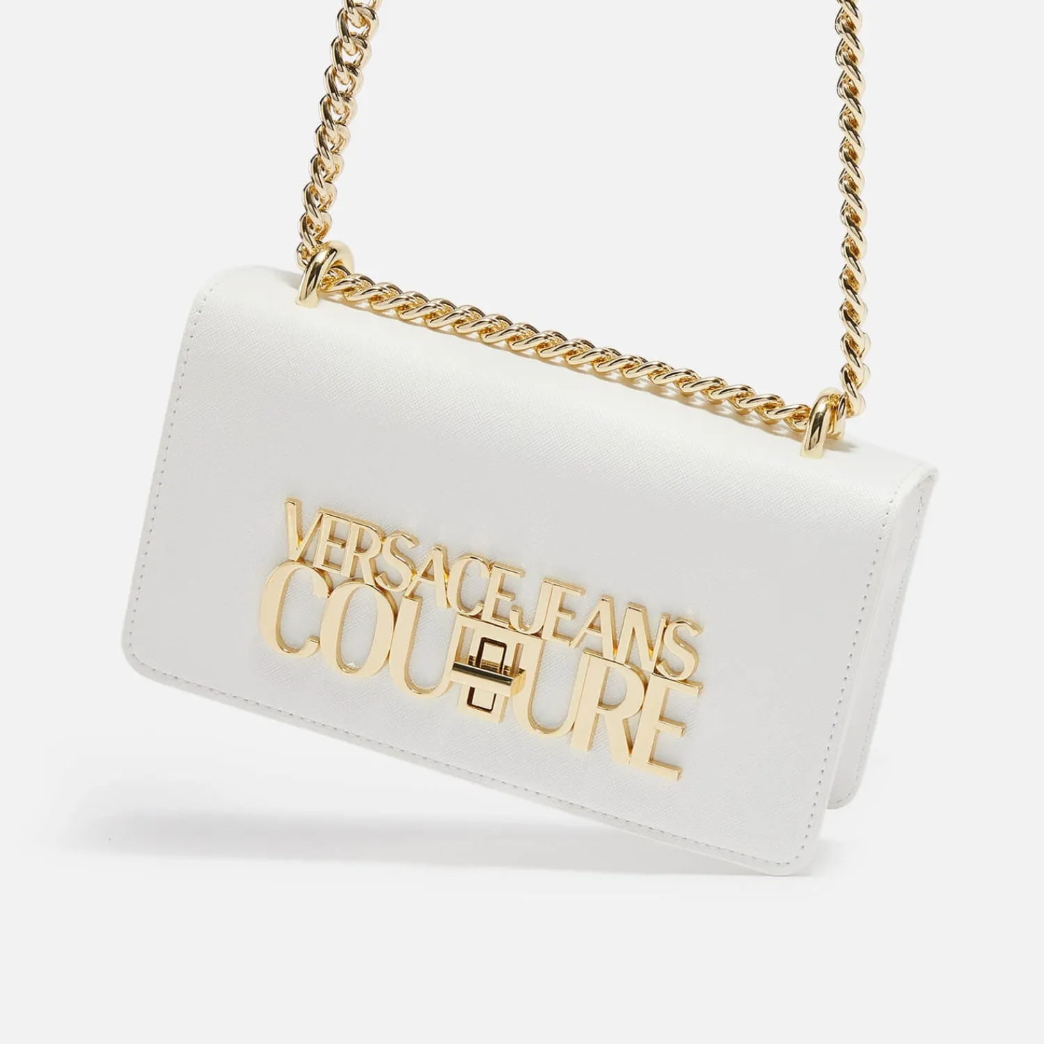 Versace Jeans Couture Cross-Body BagWhite Faux LeatherGold-Tone Chain Shoulder StrapGold-Tone HandleDesigner LogoTwist-L…