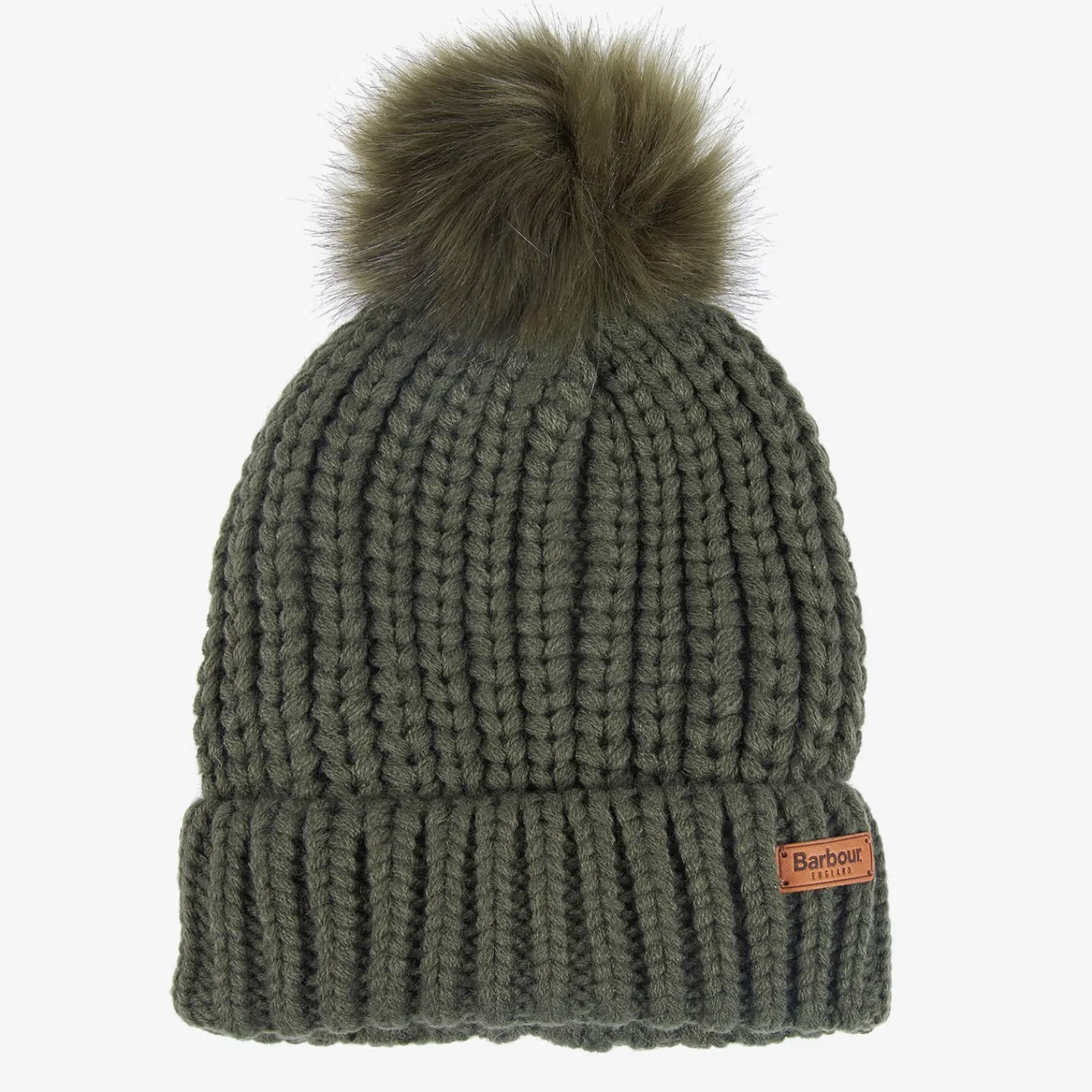 Barbour’S Khaki Saltburn Beanie Has A Chunky-Knit Construction With A Classic Upturned Rim. It’S Hallmarked With A Tan Leather Logo Patch At The Cuff And Topped With A Faux Fur Pom Pom.