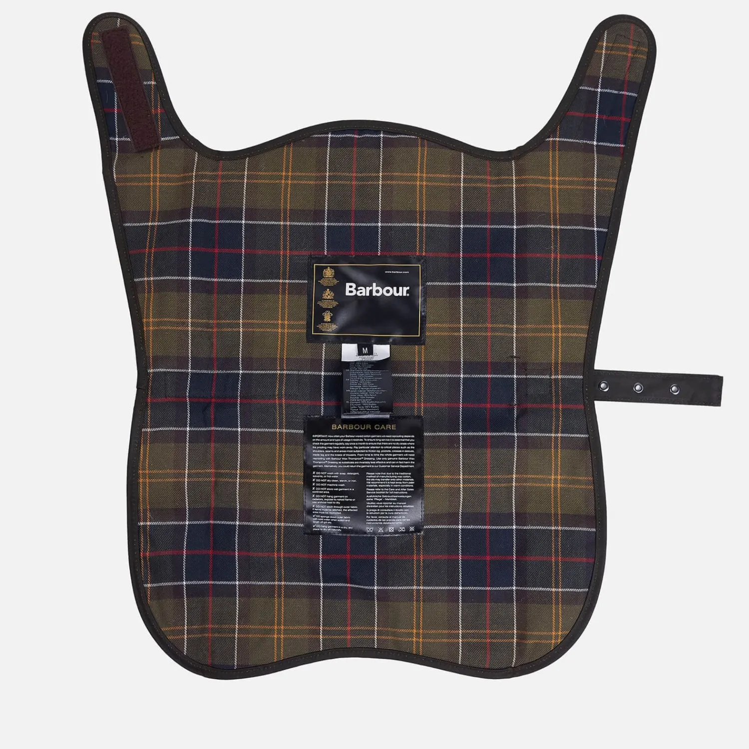 Green Wax Cotton Barbour Dog Coat With A Classic Tartan Lining And Lightweight Wadding For A Layer Of Warmth. The Matt Finish Dog Coat Has A Signature Cord Collar A Velcro Strap Around The Collar And A Buckle Adjustable Underbody Strap. Barbour Branded Hardware And A Logo Patch Complete The Waxed Cotton Dog Coat.