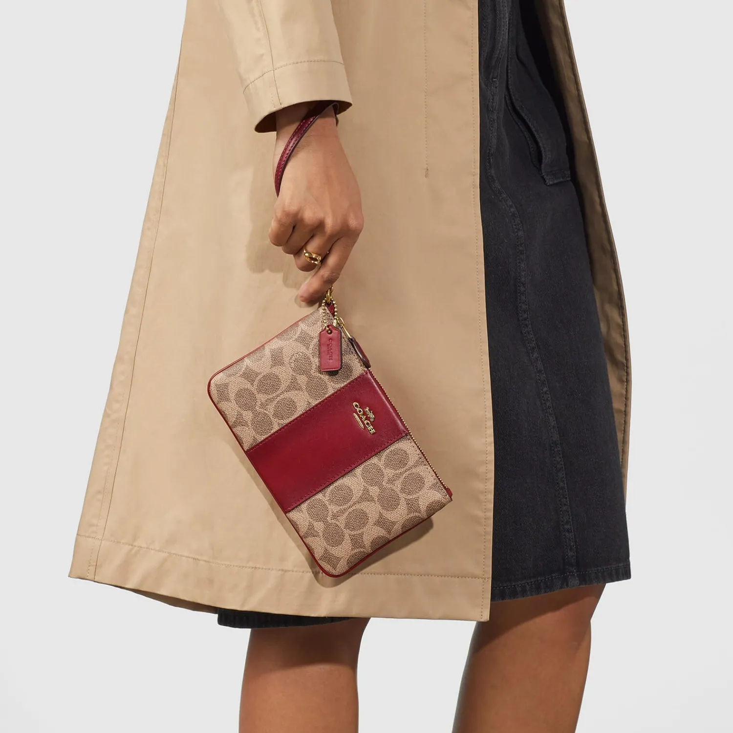 Carry Just The Essentials With This Petite Wristlet Bag By Coach. Crafted From Signature Coated Canvas With A Colourblock Leather Trim The Slender Silhouette Features Gold-Tone Hardware For Signature Polish. Wear It On Your Wrist Or Clip It Inside A Larger Bag.