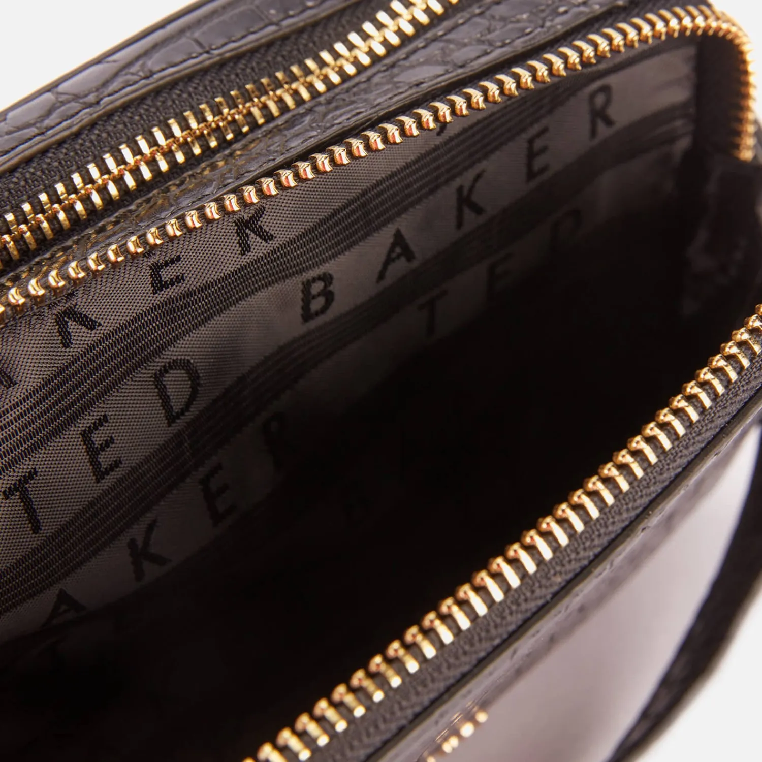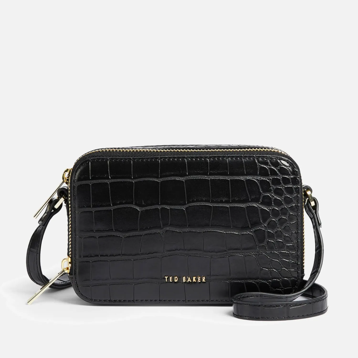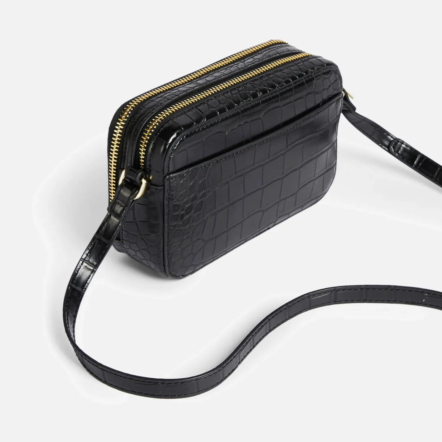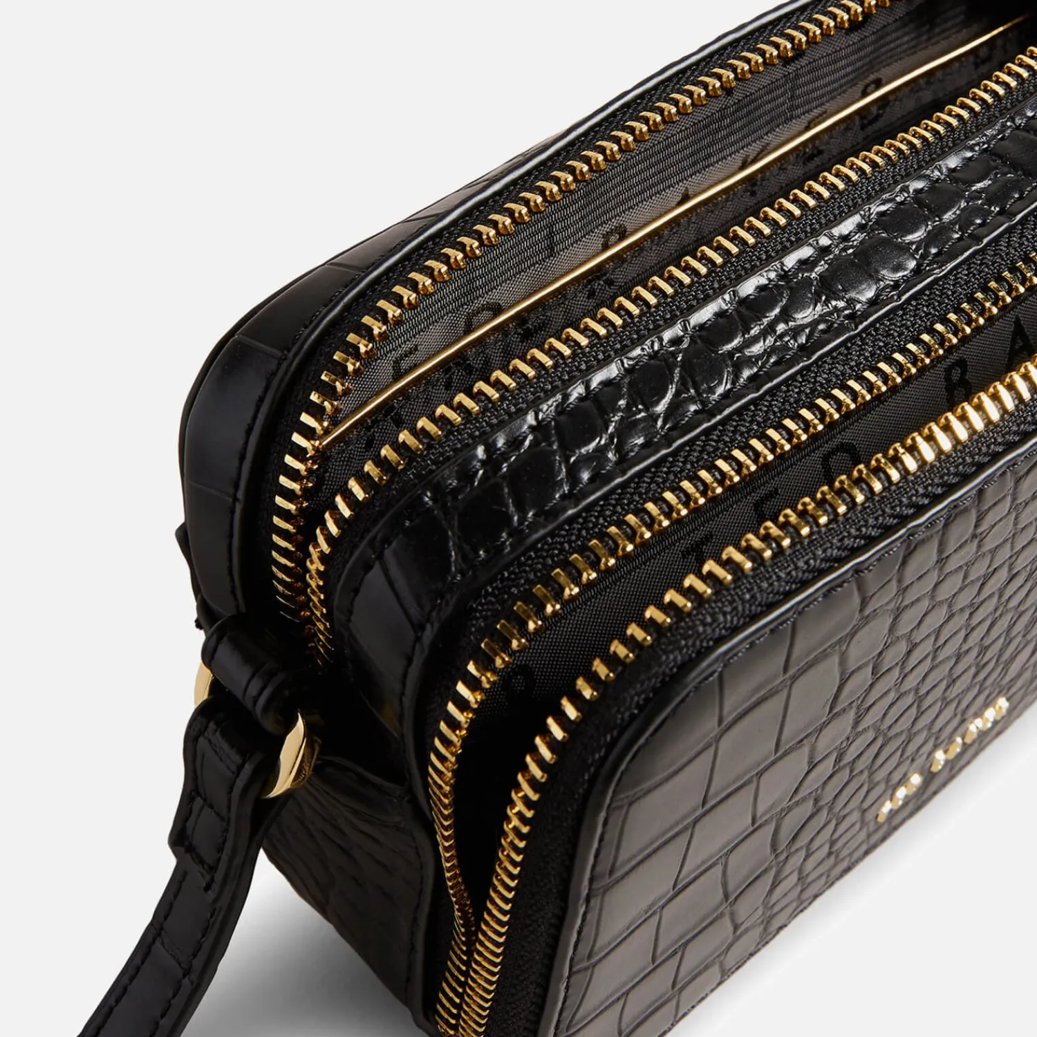 Ted Baker’S Stina Mini Camera Bag Is Sheathed In A Black Crocodile-Print And Presents Function With A Modern Edge. It Is Dual-Sided Featuring Two Main Compartments A Tonal Shoulder Strap That Can Be Worn Across The Body And Gold-Toned Hardware. The Brand’S Signature Logo Also Punctuates The Front Of The Design.