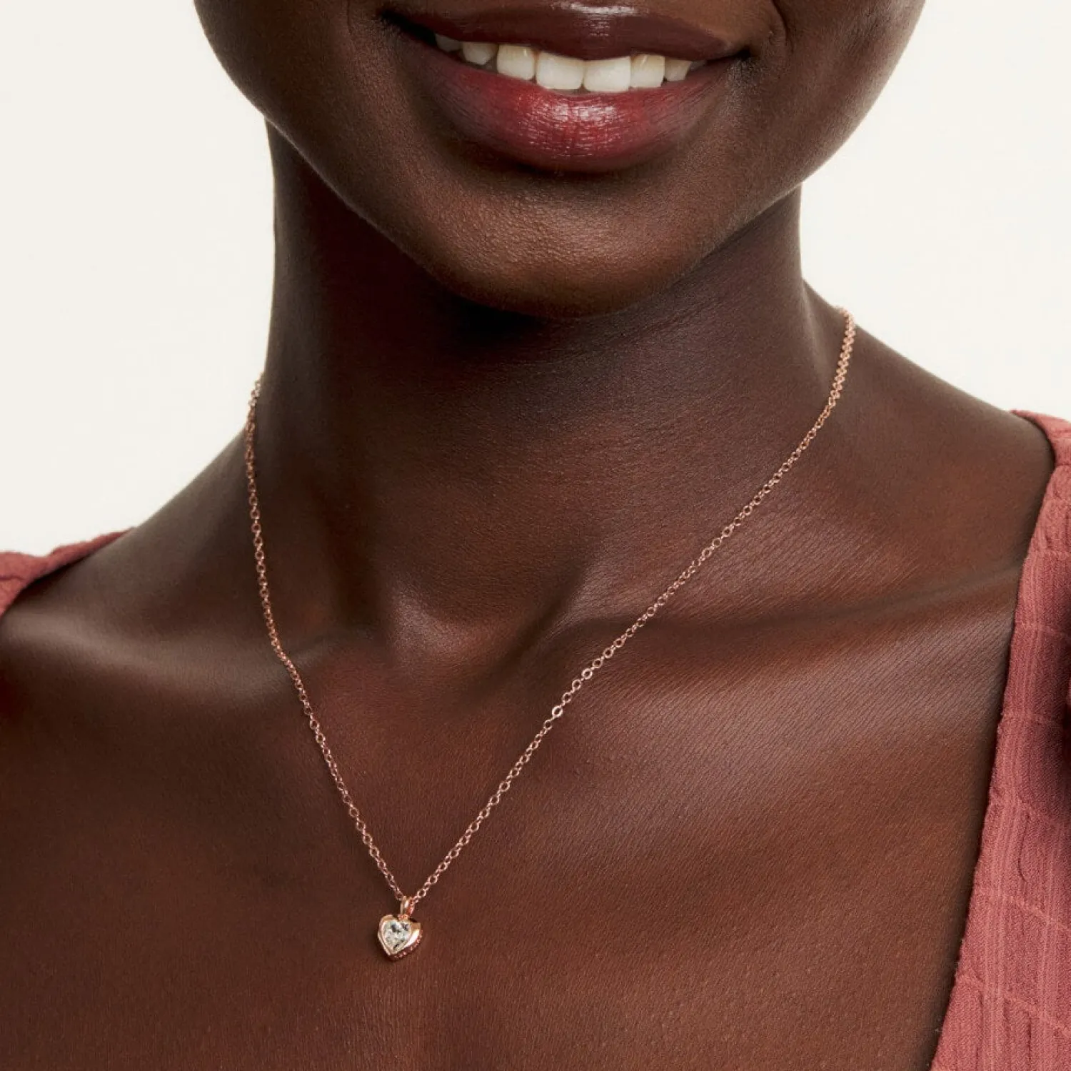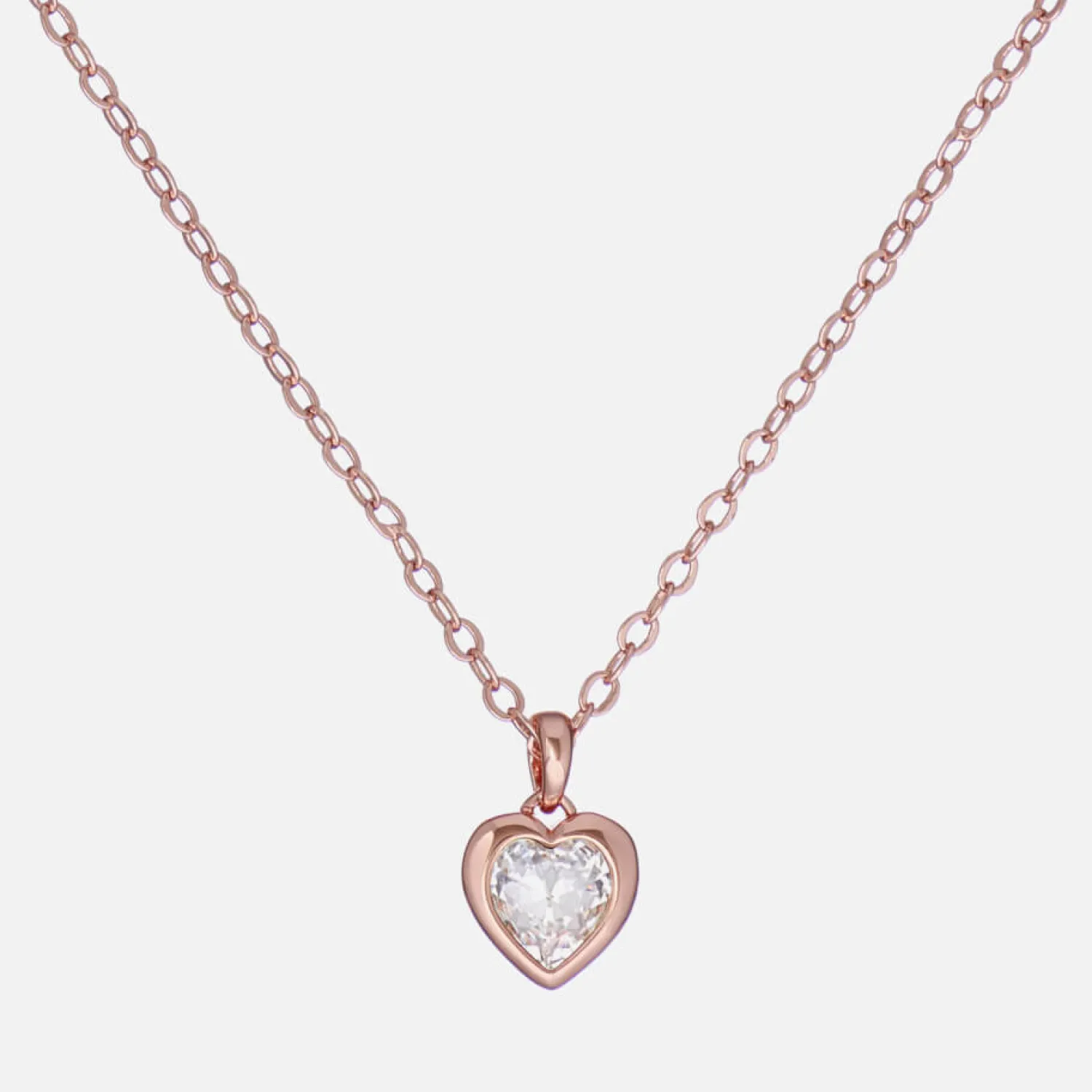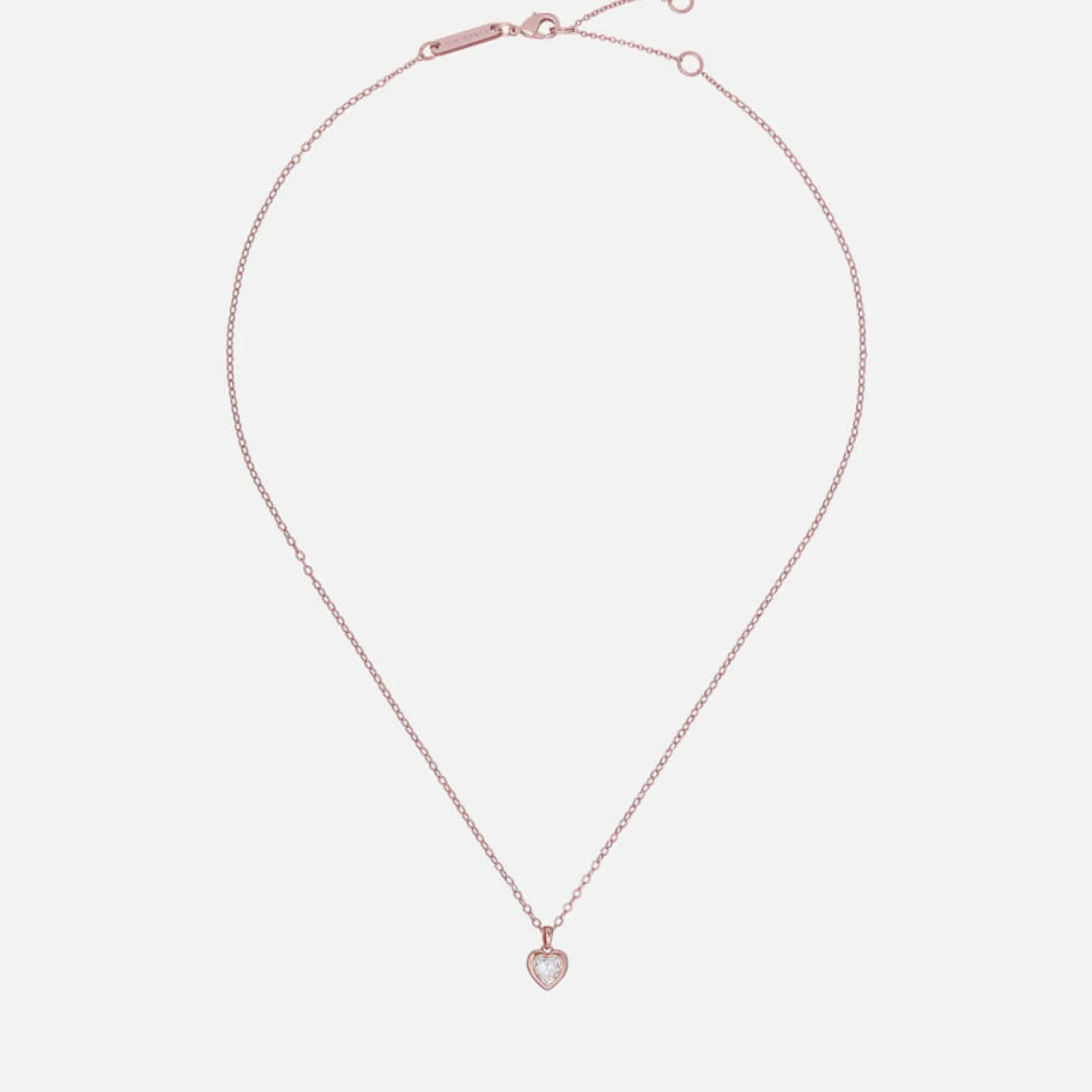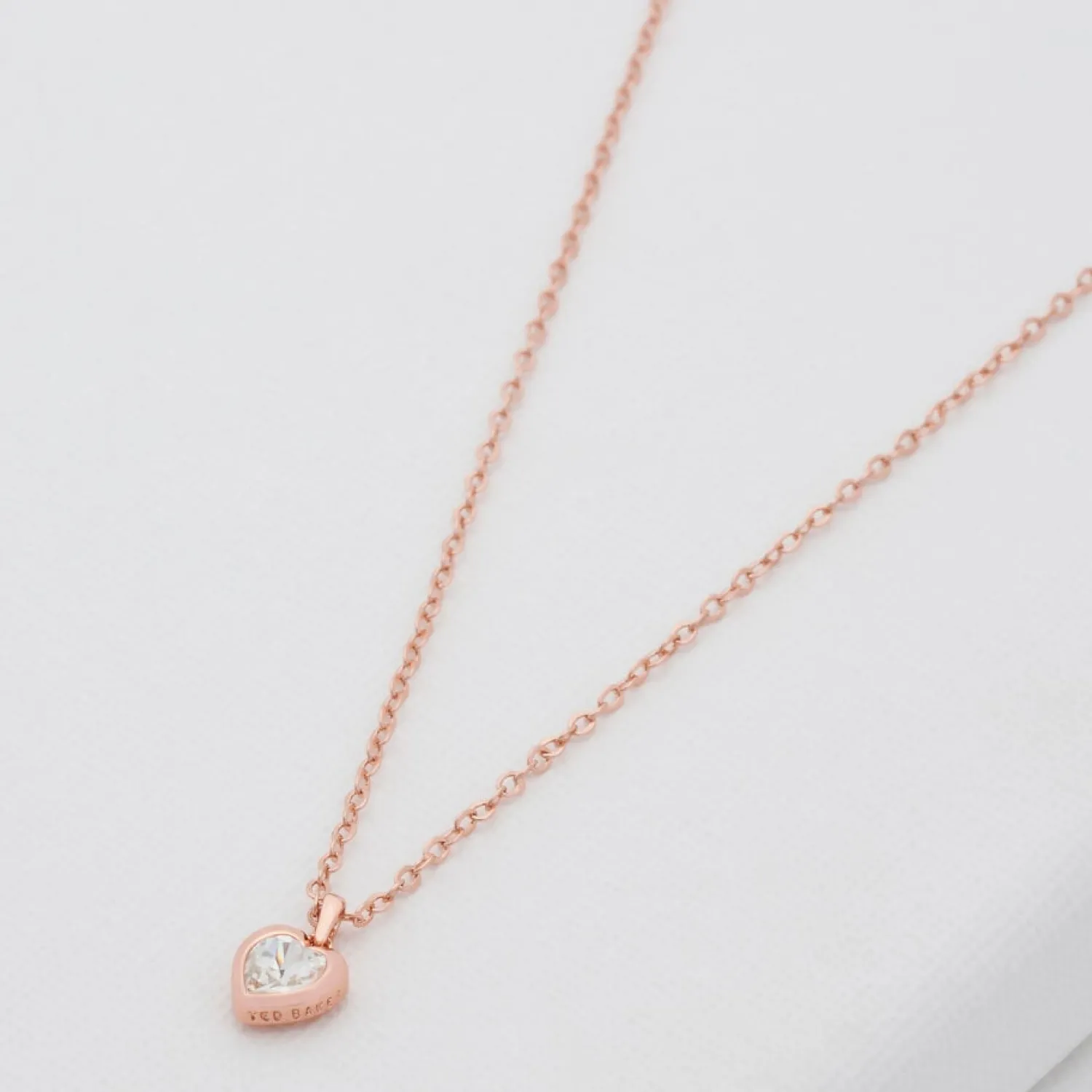 Women’S Heart-Shaped Pendant From Quintessentially British Fashion Label Ted Baker’S Accessories Collection. Suspended From A Delicate Chain The Necklace Features A Heart-Shaped Crystal Encased In A Rose Gold-Plated Brass Pendant Engraved With Ted Baker Branding. Secured To The Neck With A Lobster Clasp And Finished With A Crystal-Encrusted Metal Charm Formed In The Shape Of The Brand’S Iconic Bow Logo.