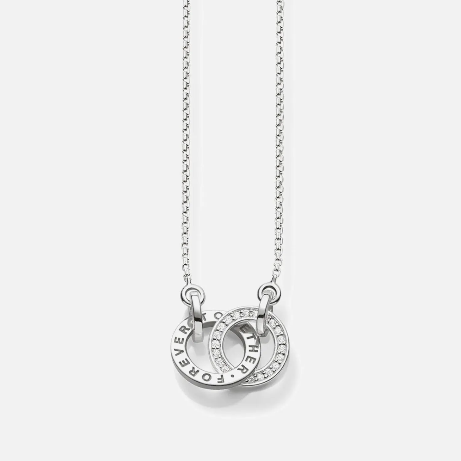 Crafted From Sterling Silver Thomas Sabo’S Together Forever Necklace Showcases Two Intertwined Rings Suspended From An Elegant Cable Chain. While One Is Embellished With Sparkling Cubic Zirconia Pave The Other Is Engraved With The Eponymous Phrase. It’S Said To Symbolise The Inseparable Bond Of Two Lovers.