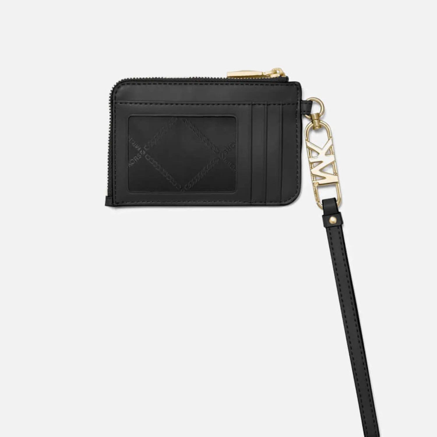 - Designer Logo Designer Tag Gold-Tone Hardware Zipped Coin Compartment One Card Slot Detachable Wrist Strap