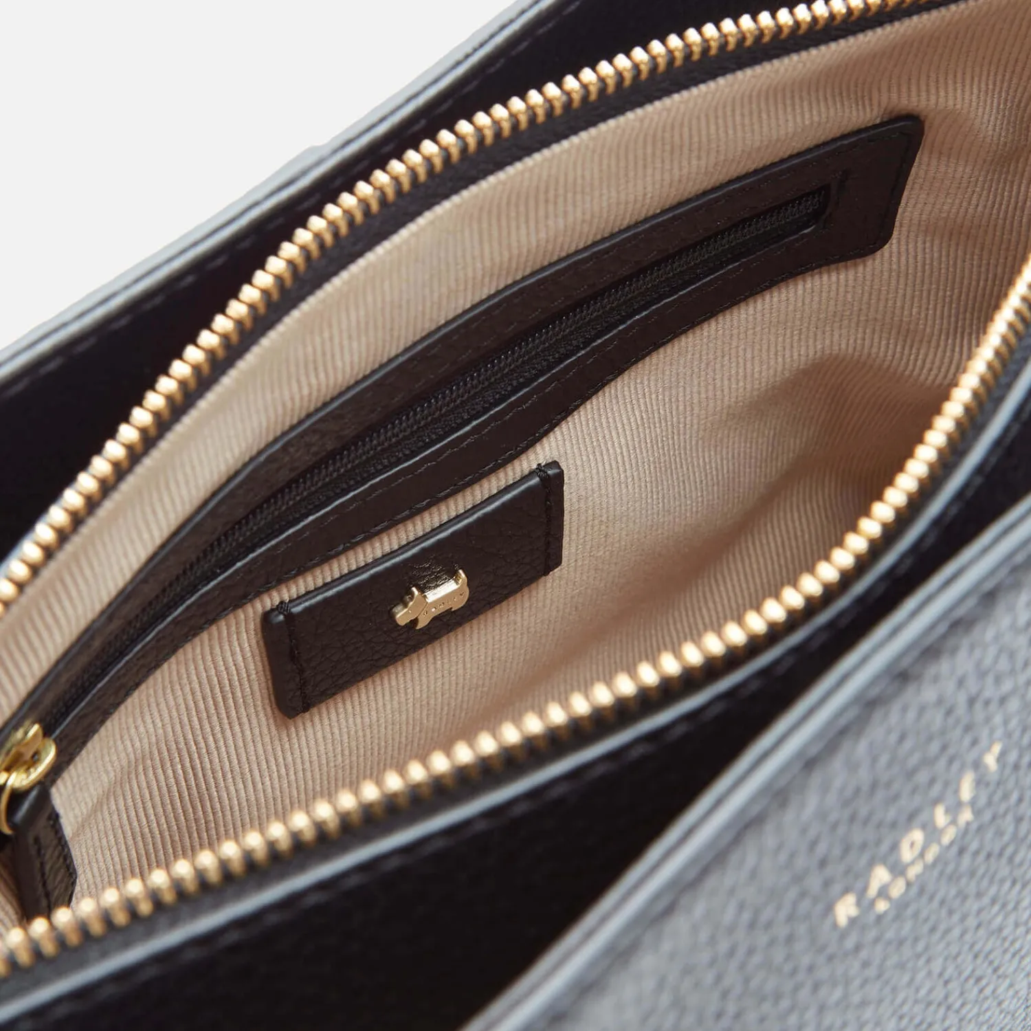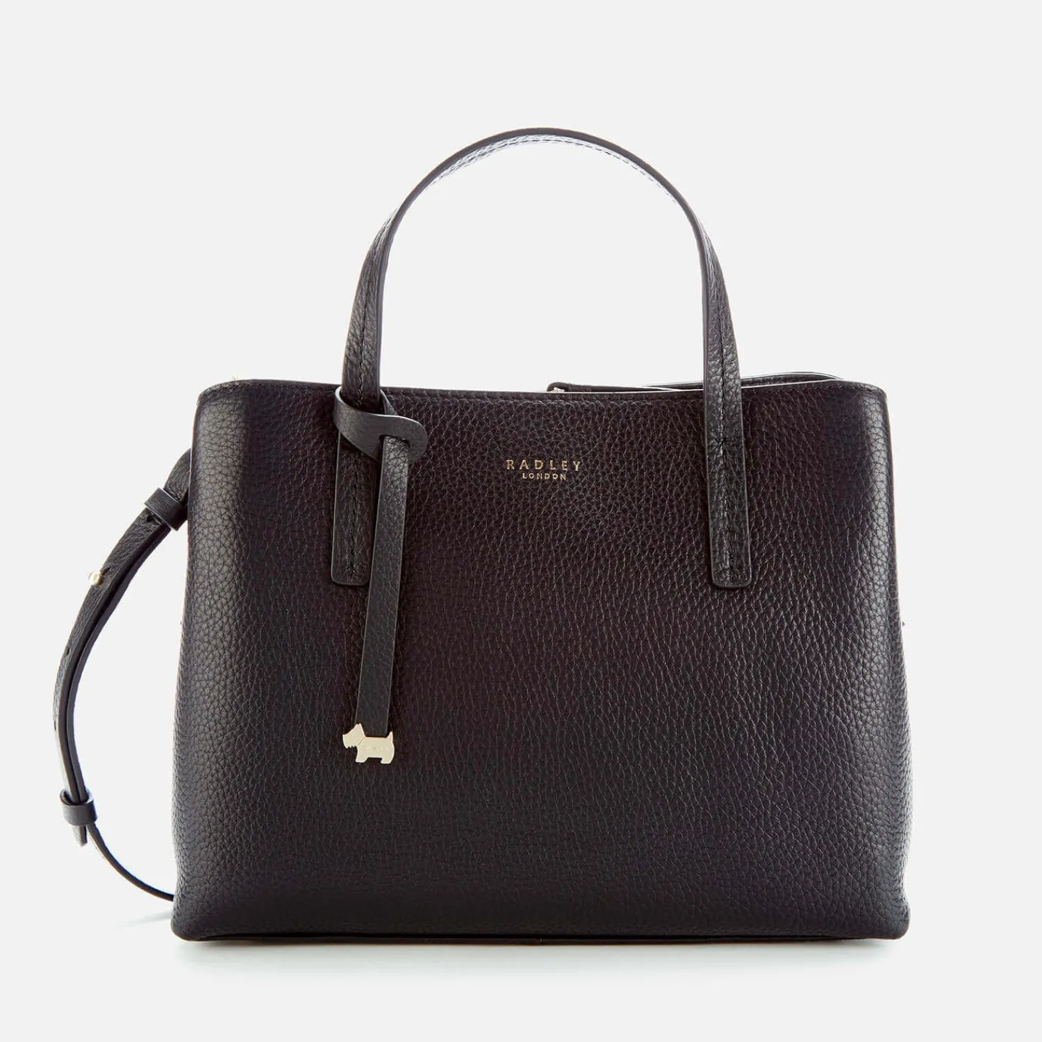 Black Multiway Bag By Radley. Textured Grain Leather Is Adorned With Gold-Toned Foiled Branding. Grab Handles And The Option Of An Adjustable Shoulder Strap Offer The Wearer Ultimate Control. The Bag Is Finished With Three Inner Sections Including A Zip-Fastening Middle Compartment Zip Pocket For Essentials And A Gold-Hued Radley Scottie Dog Charm At The Handle.