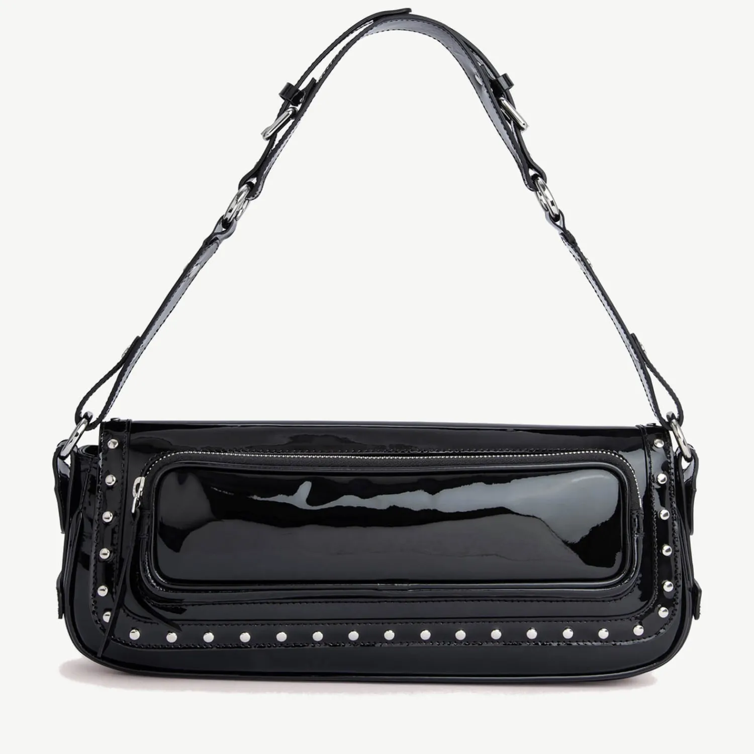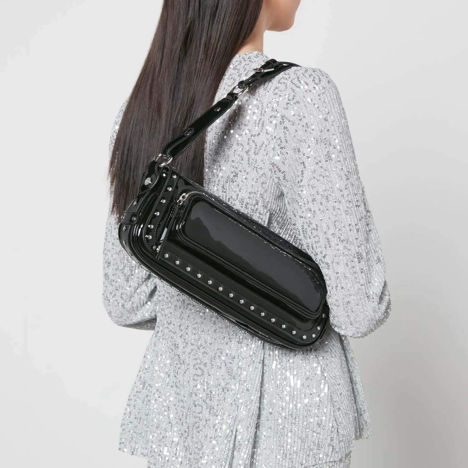 By Far Takes On A Nostalgic ’90S Aura With The Maddy Bag. Fashioned Into A Sleek Baguette Shape The Design Is Made From Black Patent Leather With Silver-Tone Studs And Is Supported By An Adjustable Shoulder Strap.