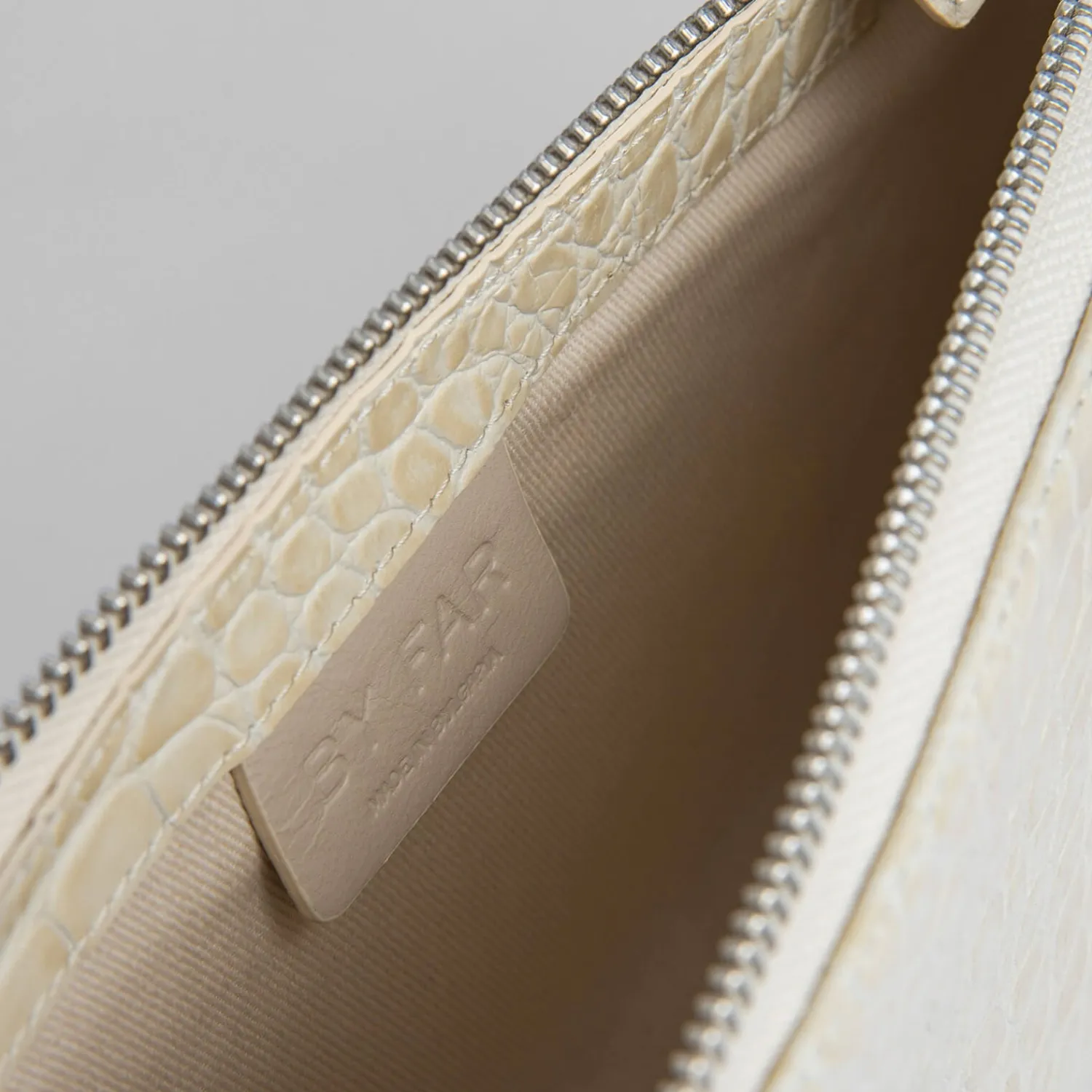 By Far’S ‘Rachel’ Handbag Is Crafted From Cream Leather With A Croc-Embossed Design. The Slim Strap Is Fastened Using Silver Tone Hardware To Match The Zip Top Opening Which Reveals One Internal Compartment Lined With Cotton. A Logo Panel Features Inside.