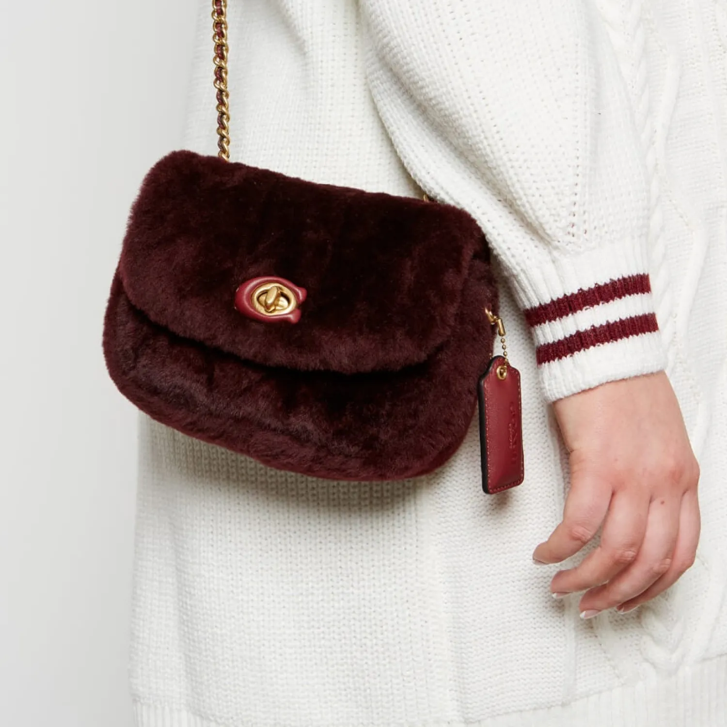 Coach Pillow Madison 18 Shoulder BagBurgundy Quilted ShearlingChain-Trimmed StrapDesigner TagGold-Tone HardwareInternal…
