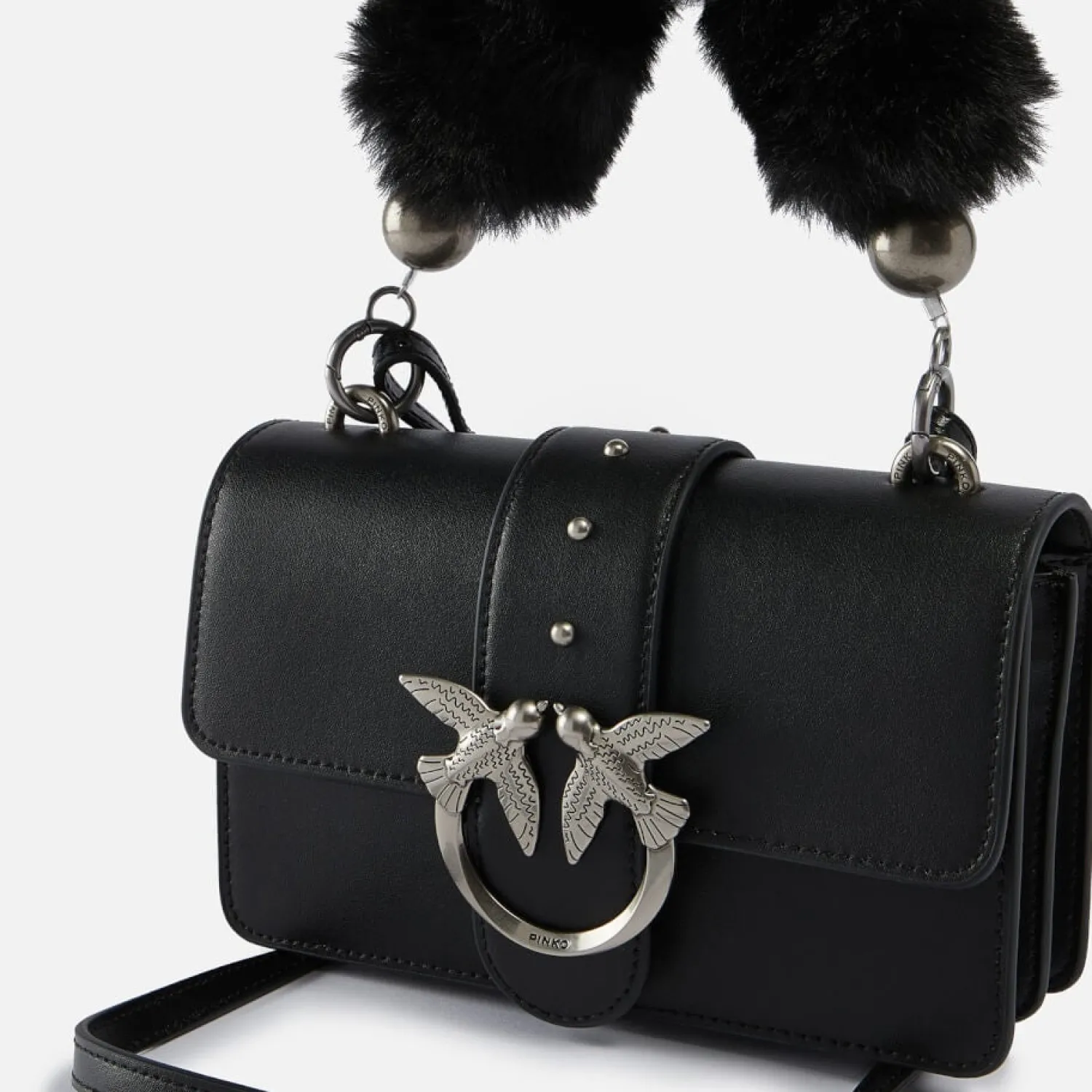 Pinko Love Mini Icon Shoulder BagBlack Leather And Faux FurAdjustable Shoulder StrapDetachable HandleDesigner PlaqueSilv…