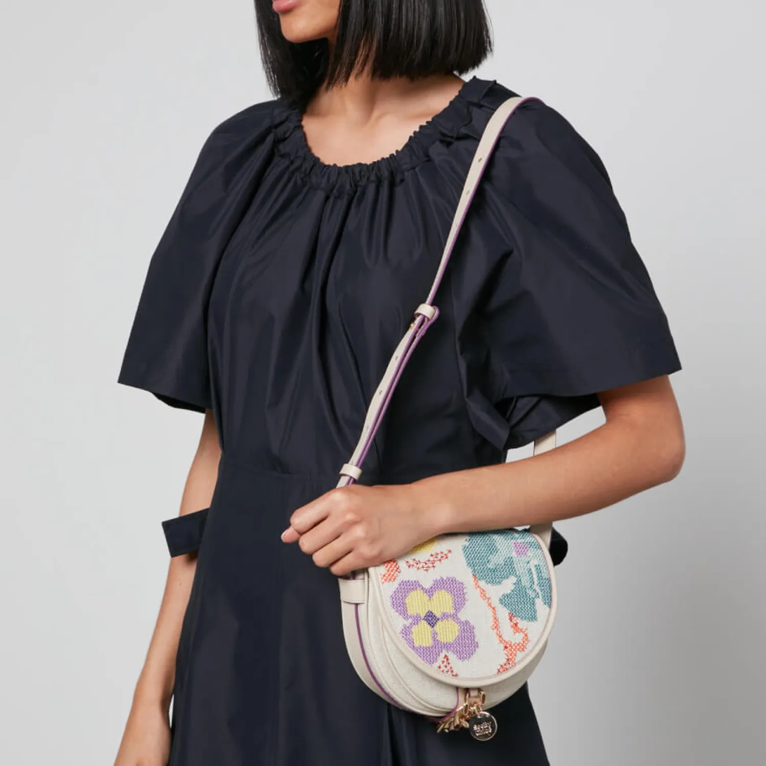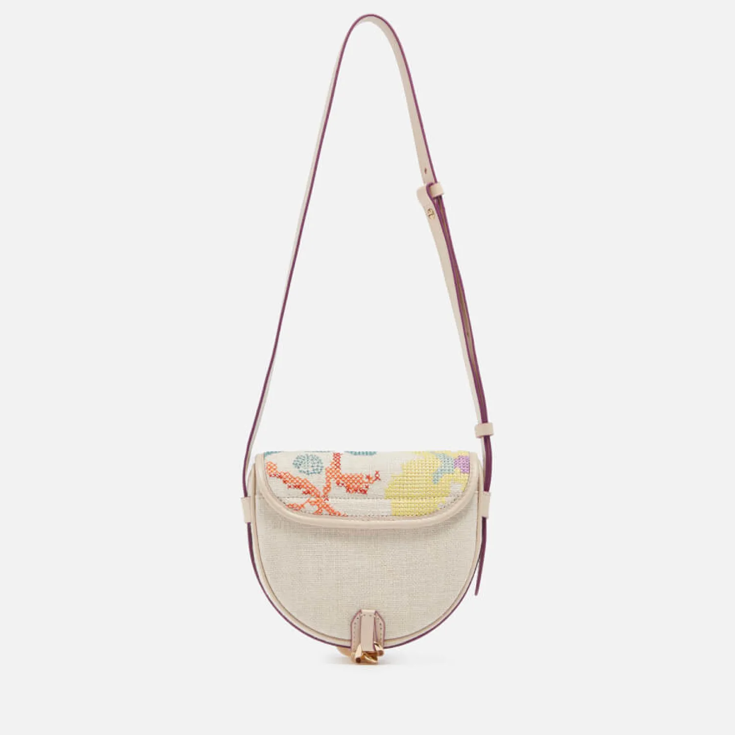 This See By Chloe Mara Bag Perfectly Captures The French Label’s Bohemian Mood. Made From Beige Canvas The Design Is Cut To A Crescent-Like Silhouette With Floral Cross-Stitch Detailing And An Adjustable Cross-Body Shoulder Strap. A Gold-Tone Chain Tops The Design Along With A Logo-Engraved Charm.