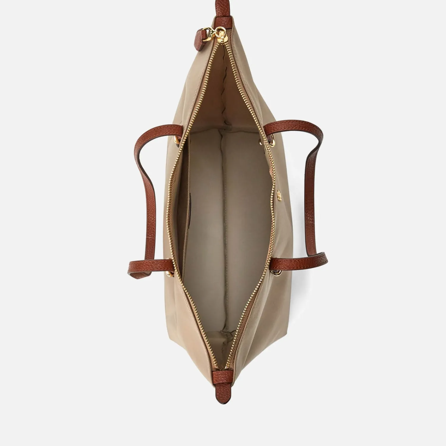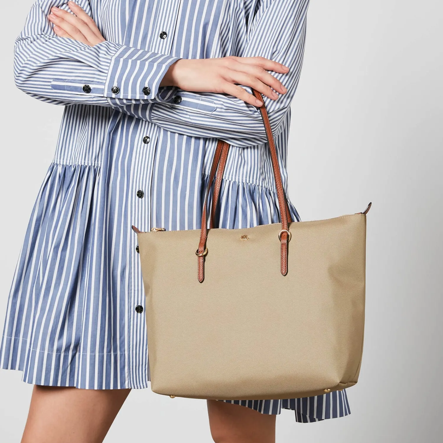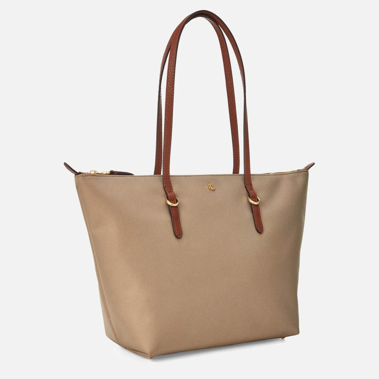 Lauren Ralph Lauren Durable Nylon Tote Bag With A Faux Leather Trim. Top Zip Closure. Gold-Tone Metal ‘Lrl’ Logo On The Front. Dual Top Handles With Gold-Tone Buckle Detail. Slip Pocket On The Interior. Gold-Tone Hardware. Includes A Branded Dust Bag.