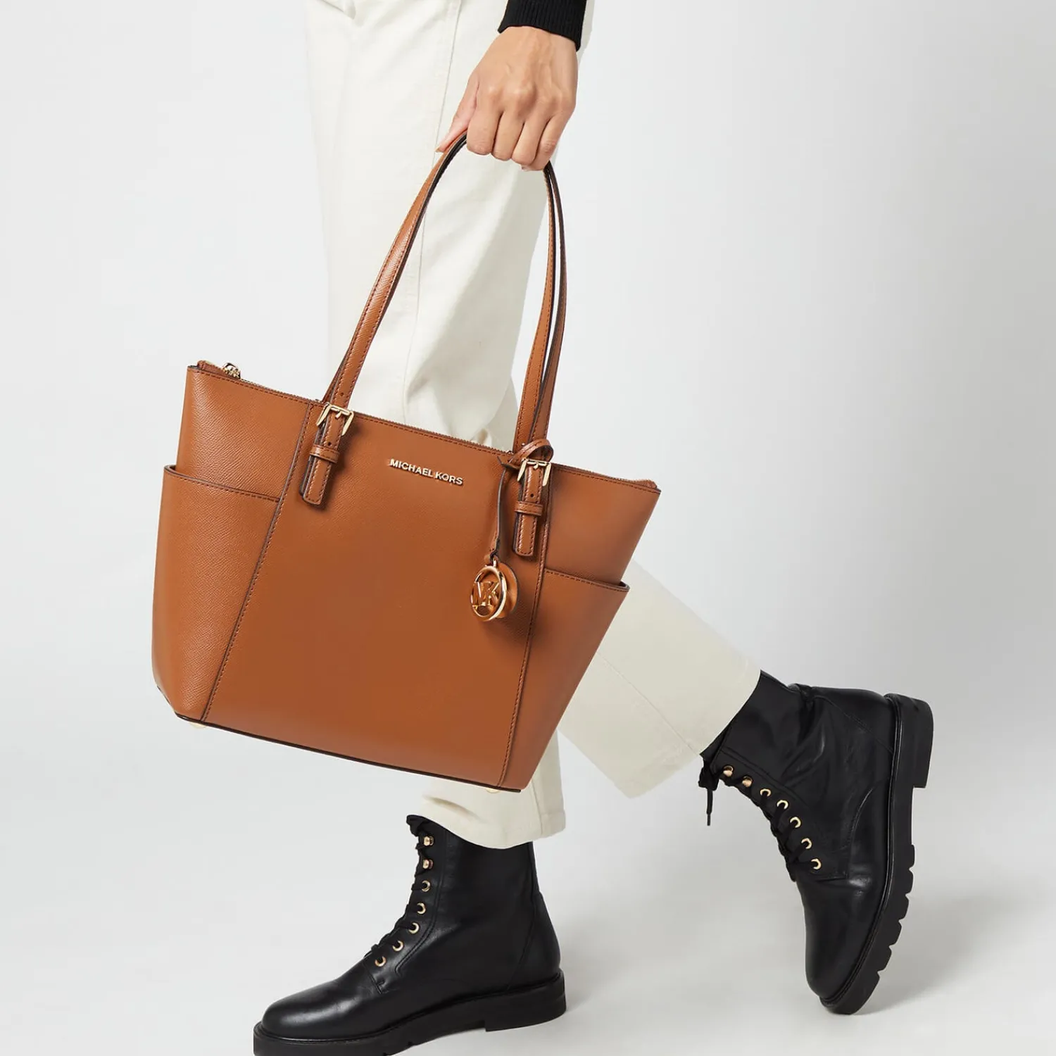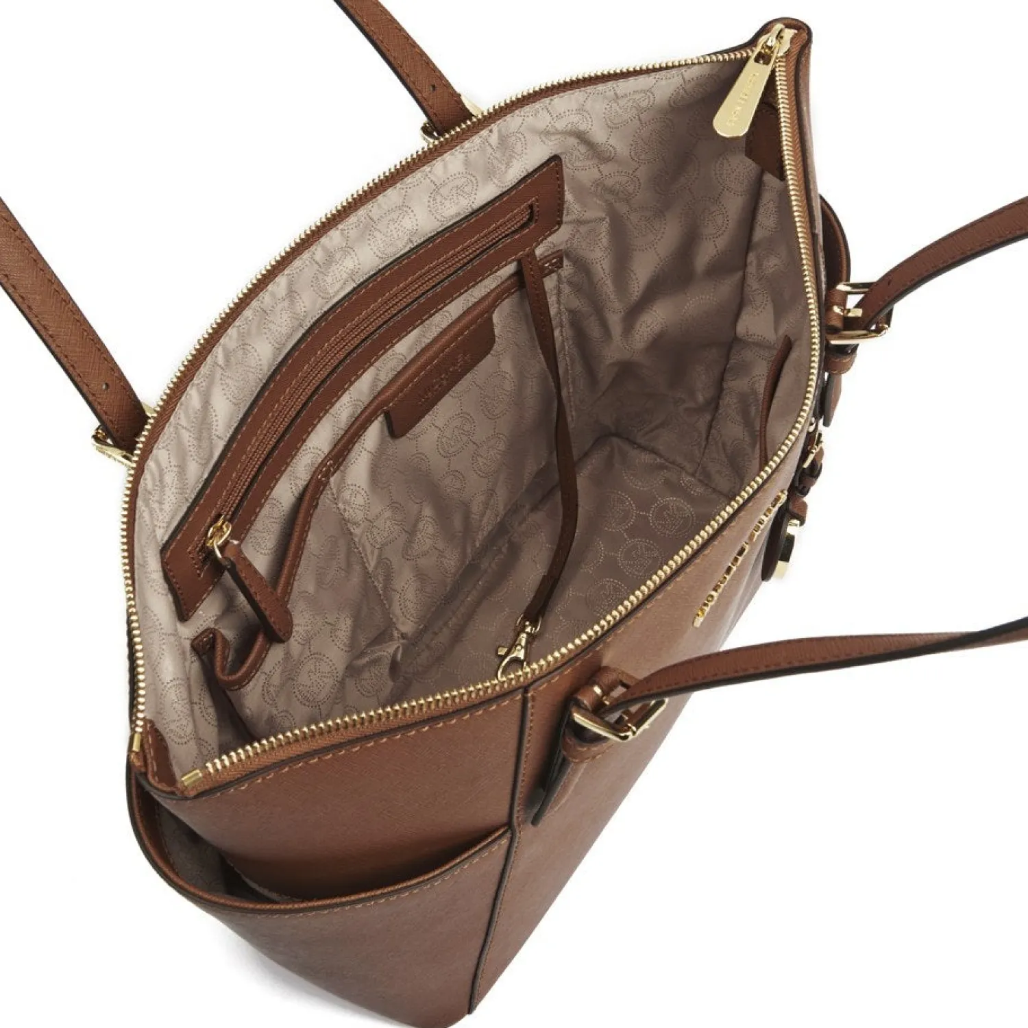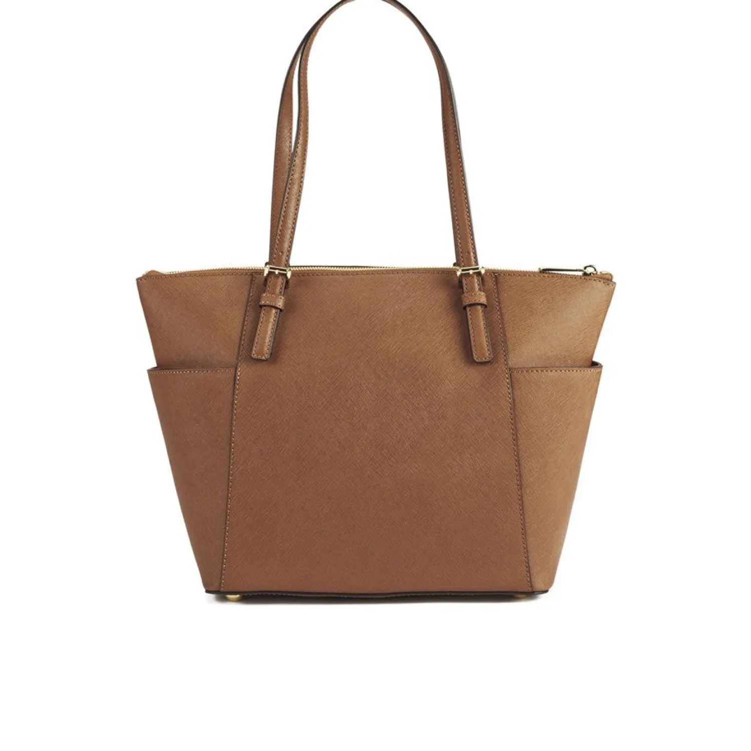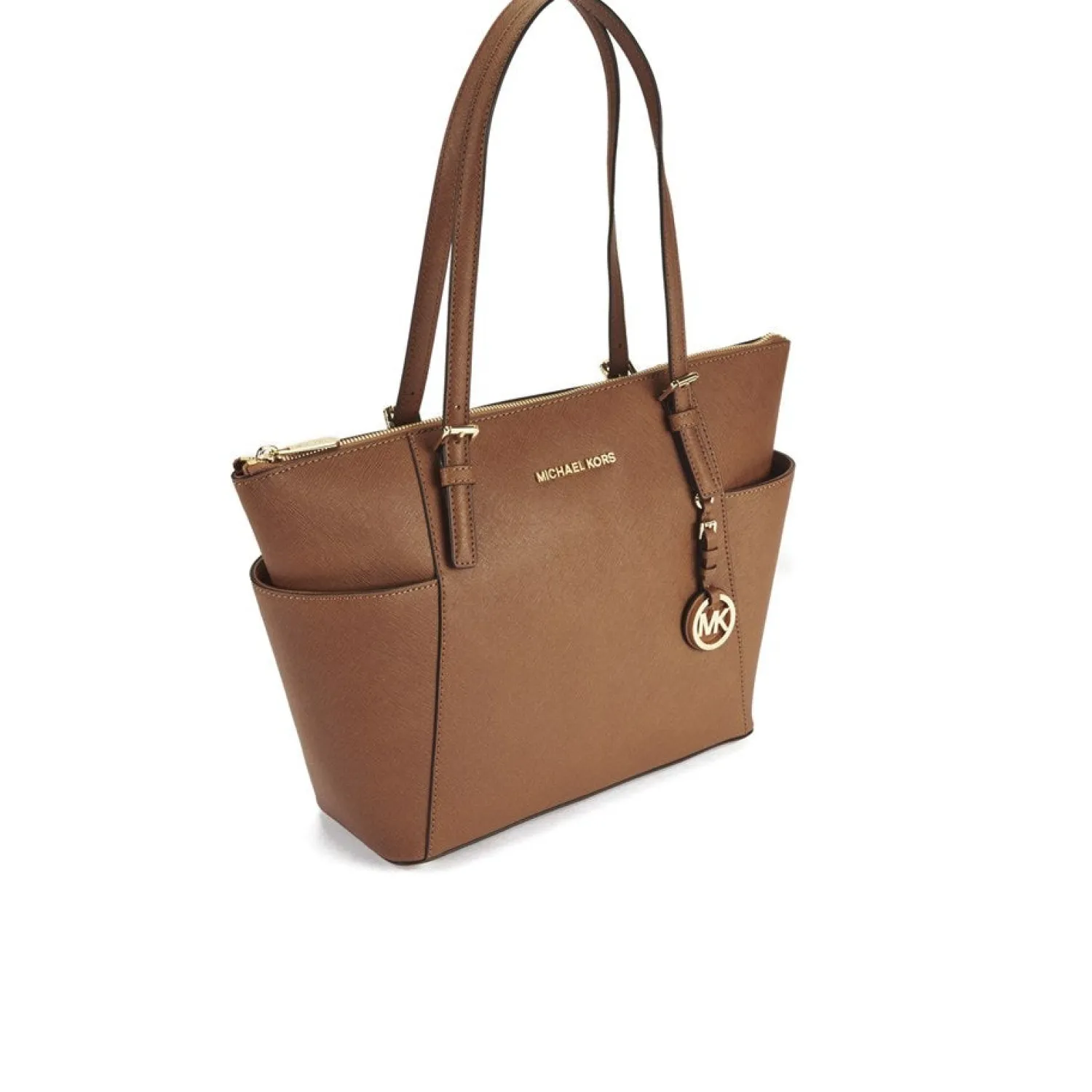 Women’s Tan Tote Bag From Michael Michael Kors With Saffiano Leather Construction And Structured Silhouette. The ‘Jet Set’ Bag Features Lateral Pockets To The Exterior For Extra Storage And A Top Zip Fastening That Opens To Reveal A Fabric Lined Interior With Multiple Zip And Slip Pockets Within. Complete With Two Flat Shoulder Straps Gold Toned Buckle Detailing And Protective Metal Feet To The Base. Applique Branding To The Front And Signature Charm. – K.N.