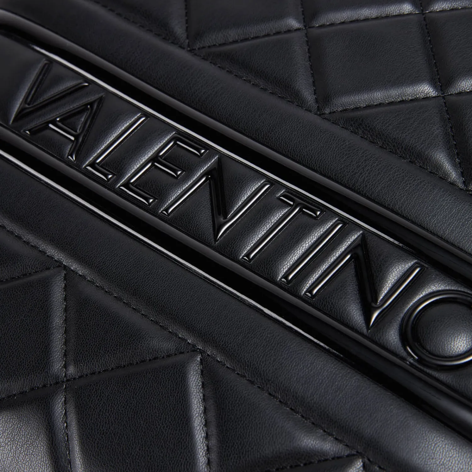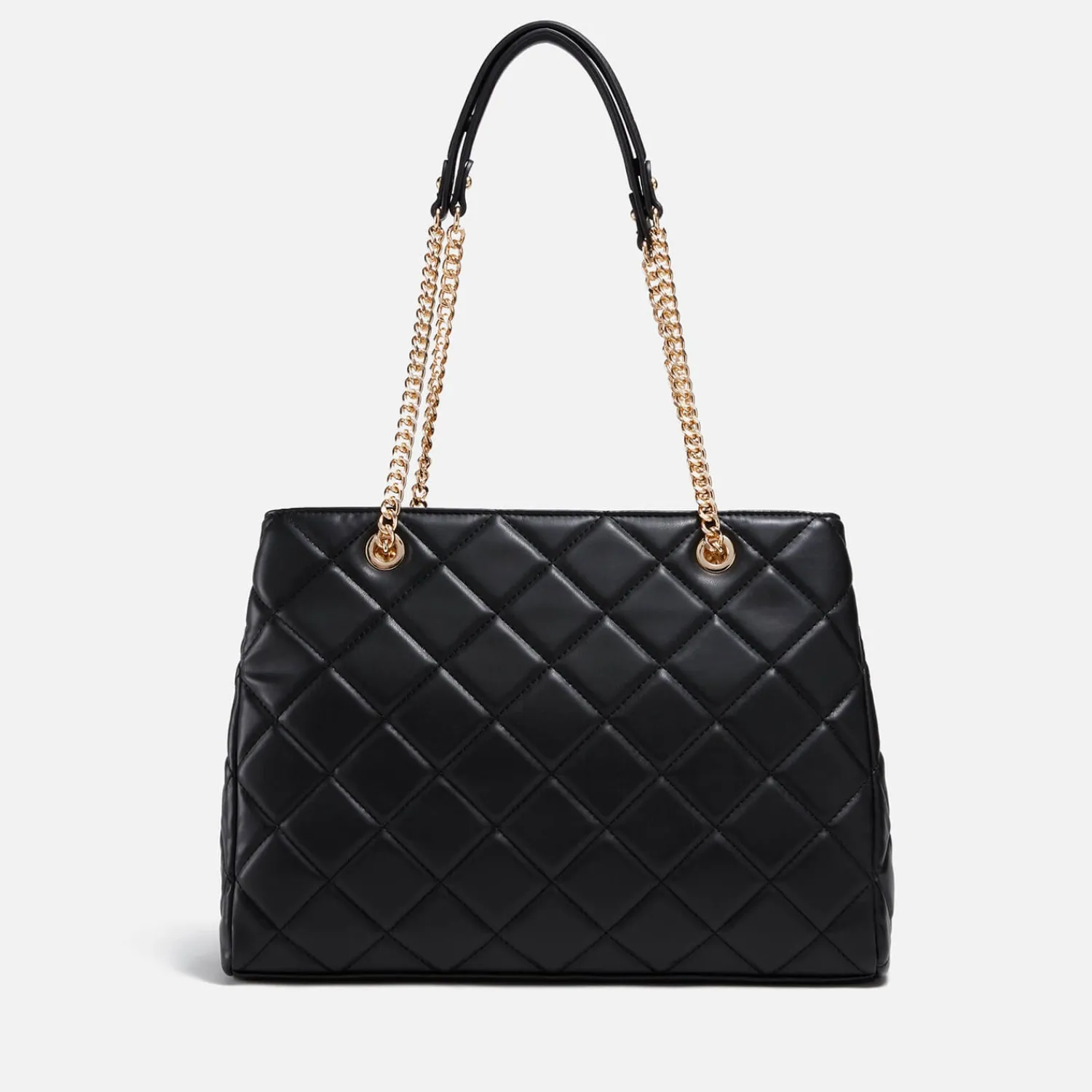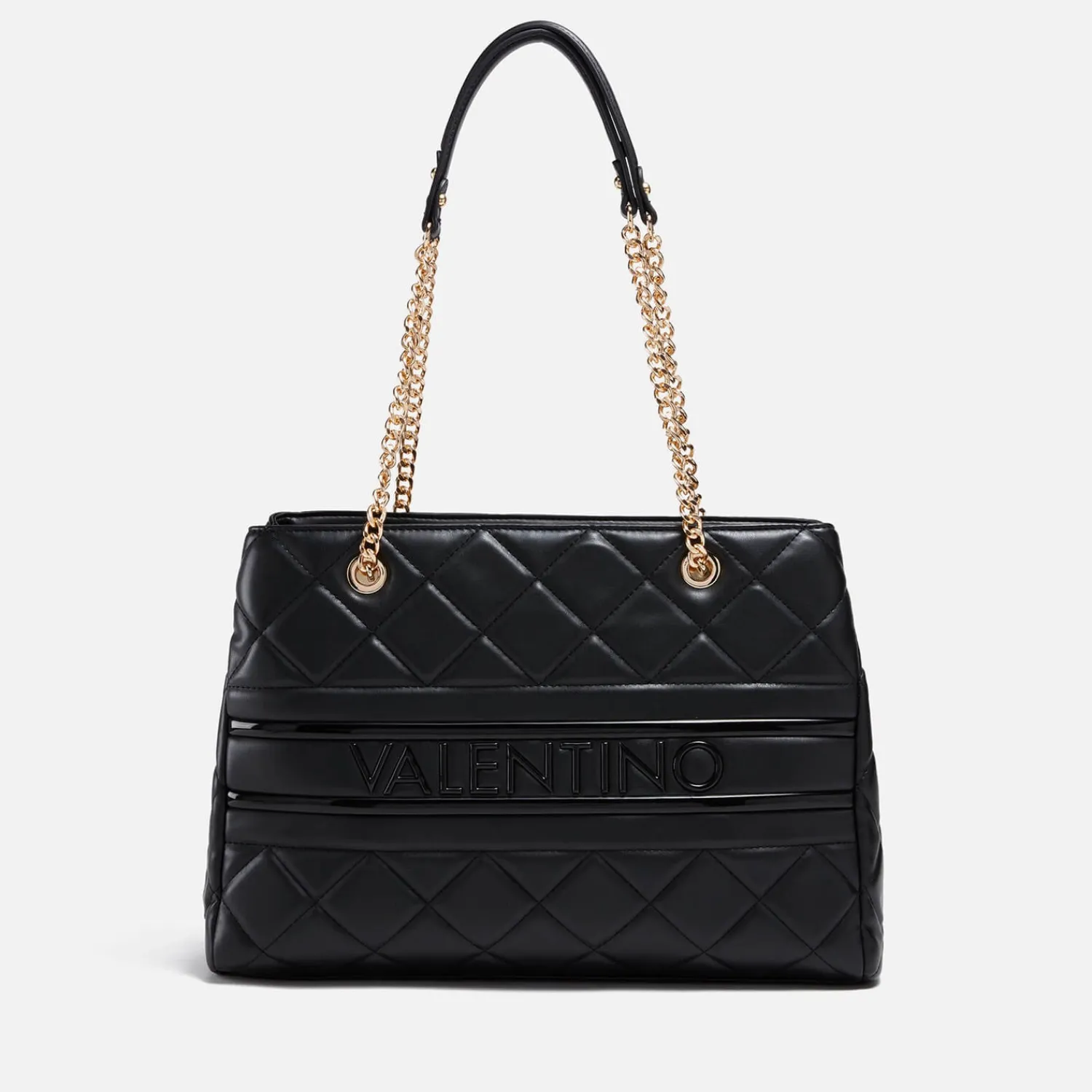 Valentino By Mario Valentino Ada Tote In Black Diamond Quilted Fabric With Tonal Branding On The Front. It Has Gold-Tone Metal Chain Handles For Carrying By Hand Or Over The Shoulder Wear. The Inside Has Multiple Open Compartments And Zipped Pockets.