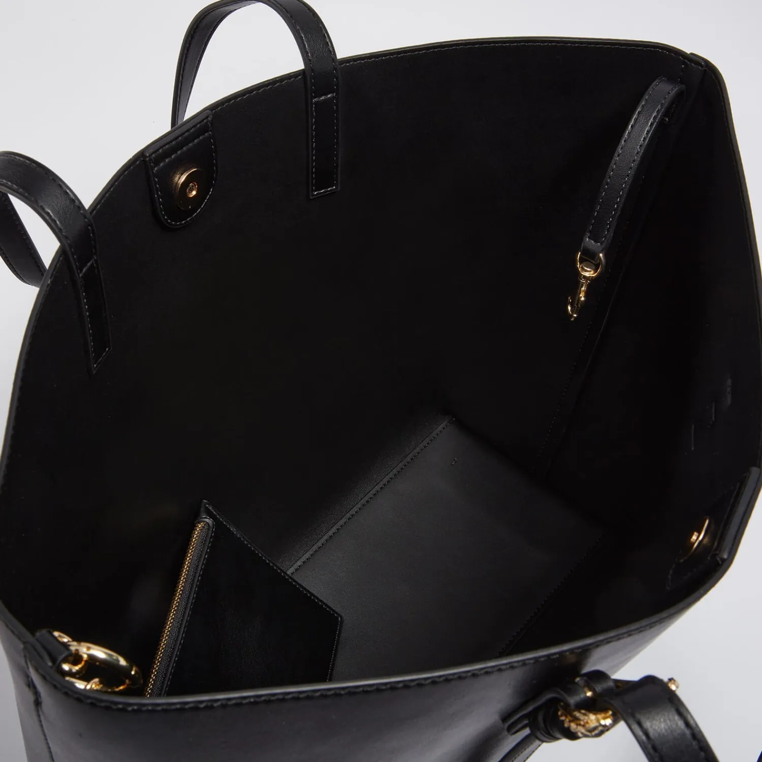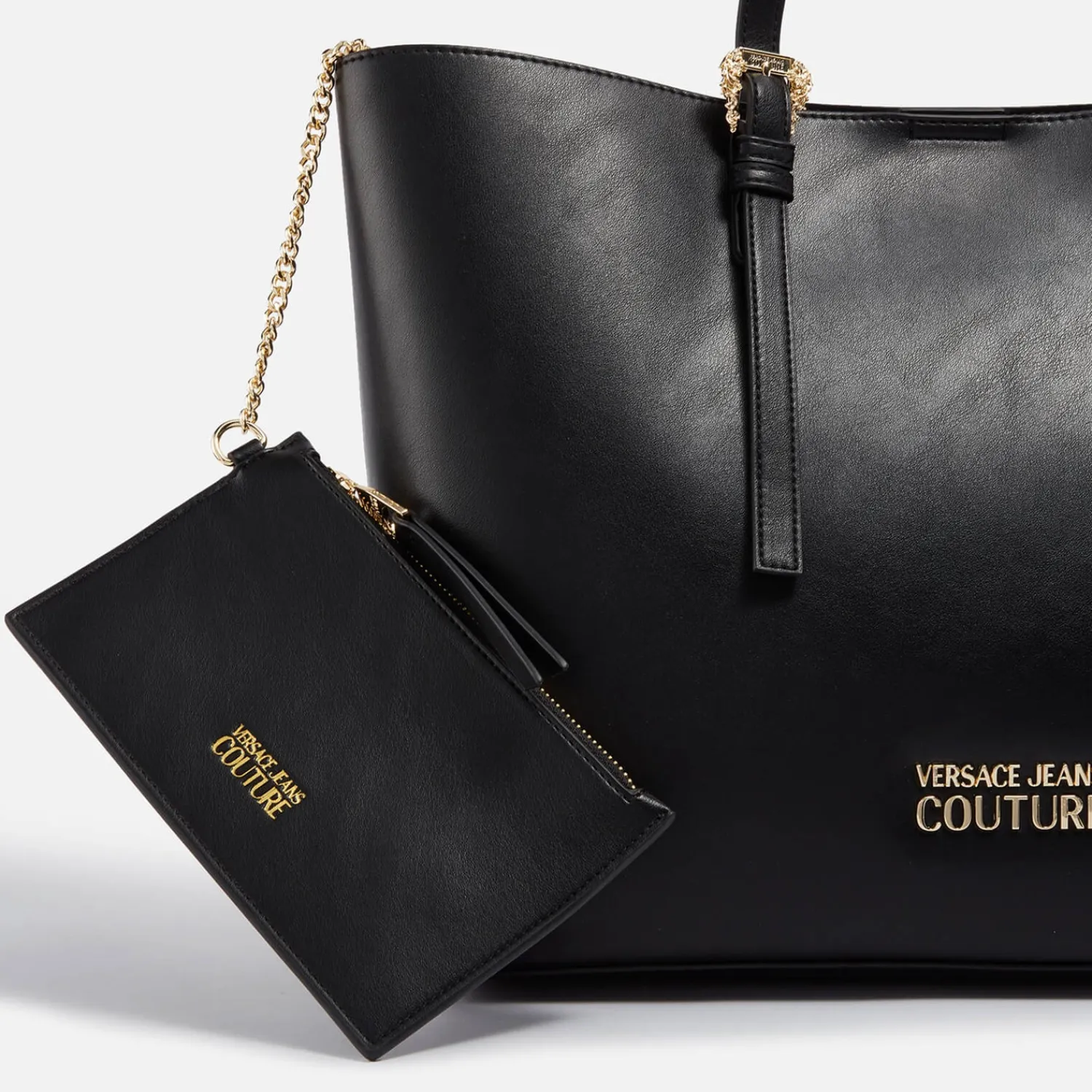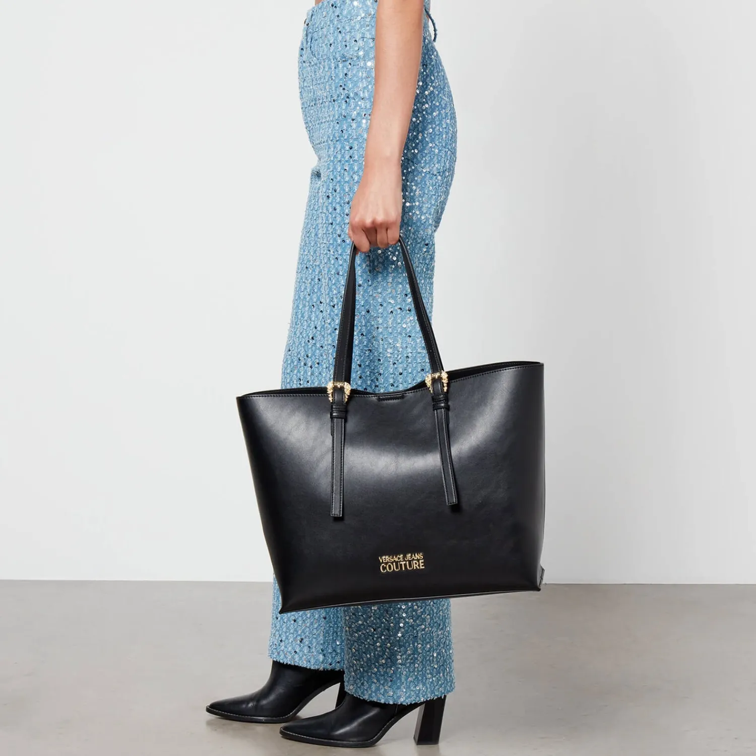 Versace Jeans Couture Tote BagBlack Faux LeatherAdjustable Top HandlesDesigner LogoDetachable Internal Zipped PouchMagne…